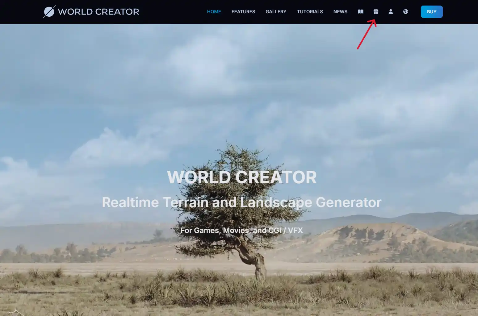 打开World Creator官方网站,点击主页上方“礼盒”小图标。中文页面可能会加载失败,建议使用英文版页面。