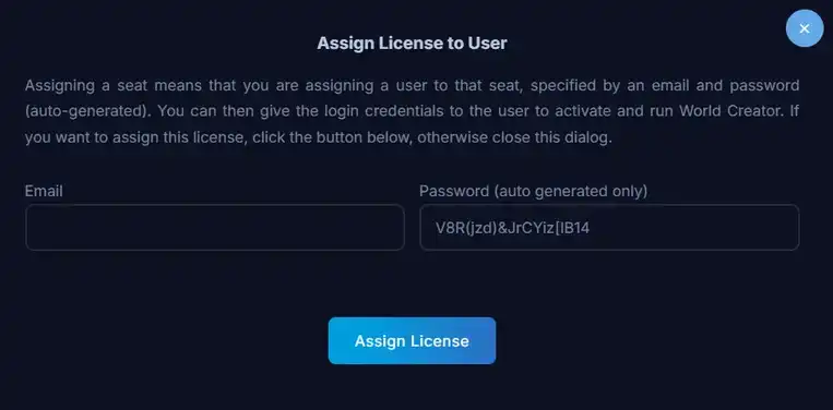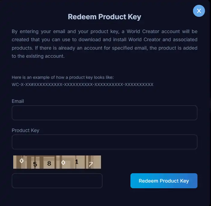 在弹出的对话框中输入您的有效电子邮箱地址(国内常用邮箱、谷歌邮箱均可使用),以及站主发送给您的产品密钥。这个邮箱地址将用于创建 World Creator 账户并管理所有与 World Creator 相关的许可证和席位。如果您之前使用过订阅版World Creator或其他的已有账户,请填写已有的账户邮箱,系统会将新的许可证和已有许可证合并到已有账户;否则系统将为您创建一个新的账户。