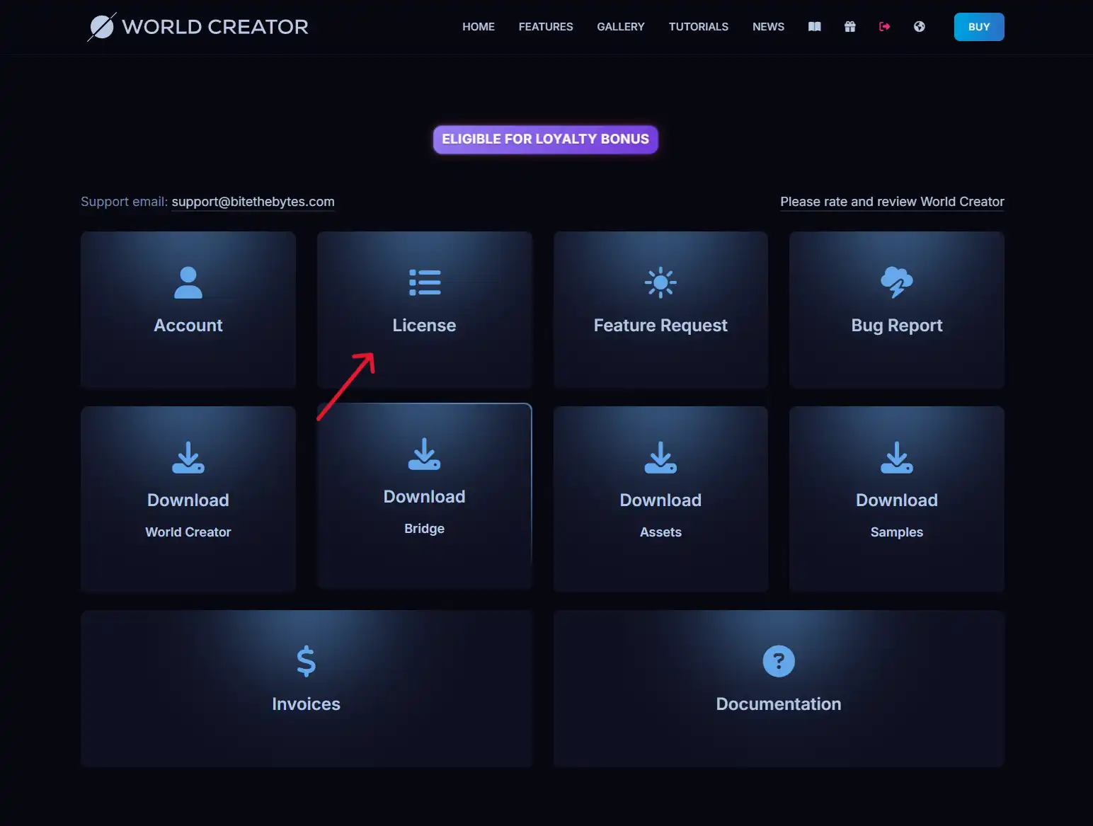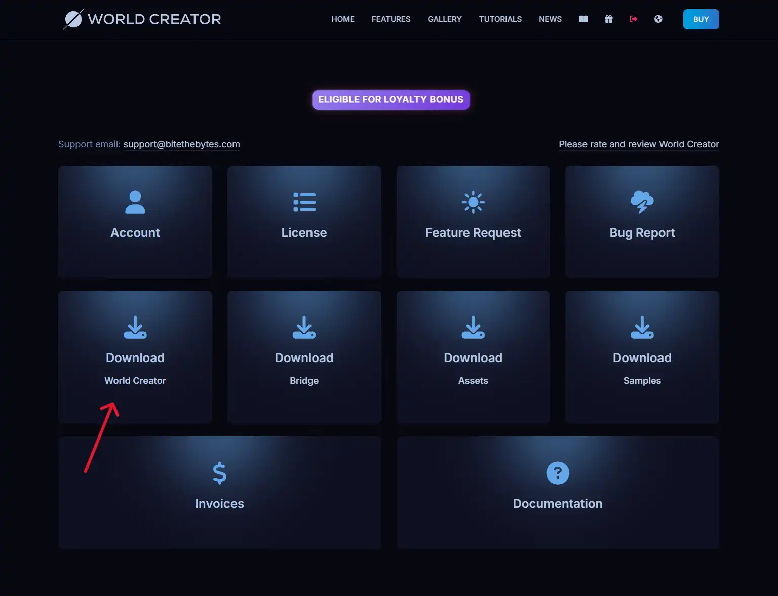 至此您已经有了一个属于自己的World Creator账户(官方不支持自行注册,未购买用户只能浏览公开页面)。您可以使用官方发送的账户信息登录到客户门户,这是一个只针对于购买客户开放的页面,在这里您可以管理个人资料和许可证,并下载 World Creator 应用程序、查看发票(官方提供的电子发票)、报告错误、请求功能、下载样例、材质和桥接工具。