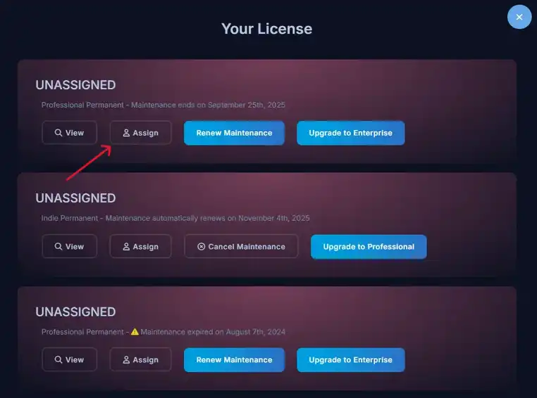 在弹出的许可证概览页面,点击“分配”按钮。注意,下图示意的是一个许可证管理多个坐席的情况,通常您只会看到其中一个坐席的信息。