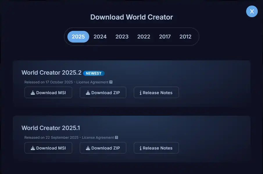 选择要下载的版本,然后单击“下载MSI”或“下载ZIP”,官方推荐下载MSI文件。最新版本标有“最新”,World Creator 2 于 2017 年发布,World Creator 1 于 2012 年发布。下载部分还告知您是否有资格运行特定版本的 World Creator,这取决于您的维护计划是否覆盖该版本发布时的发布日期。如果没有,您需要续订维护订阅才能运行最新版本的 World Creator。