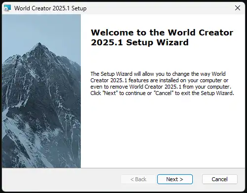 成功下载World Creator后,双击MSI安装文件即可启动World Creator安装程序。请按照每个安装步骤操作,直到安装程序完成其工作。安装完成后,您将在桌面上找到 World Creator 应用程序的快捷方式。World Creator可以多版本共存,一般建议使用最新的稳定版本作为生产使用。