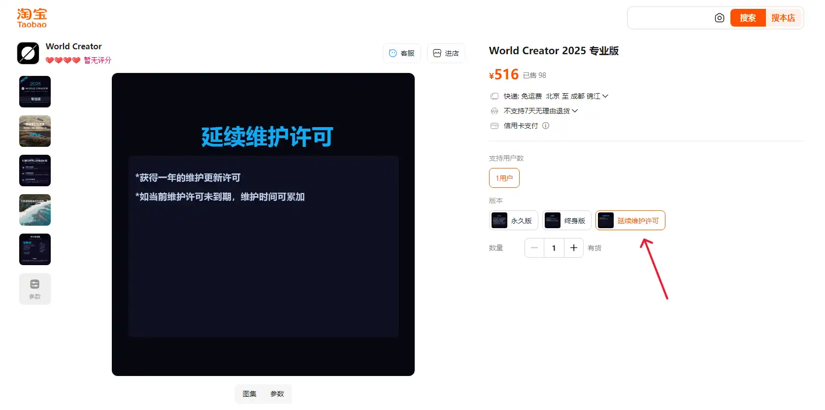 点击“购买按钮”,进入站主的淘宝店铺,选择您需要的许可证类别。首次购买可直接下单,永久版升级终身版请咨询店主后再下单。
