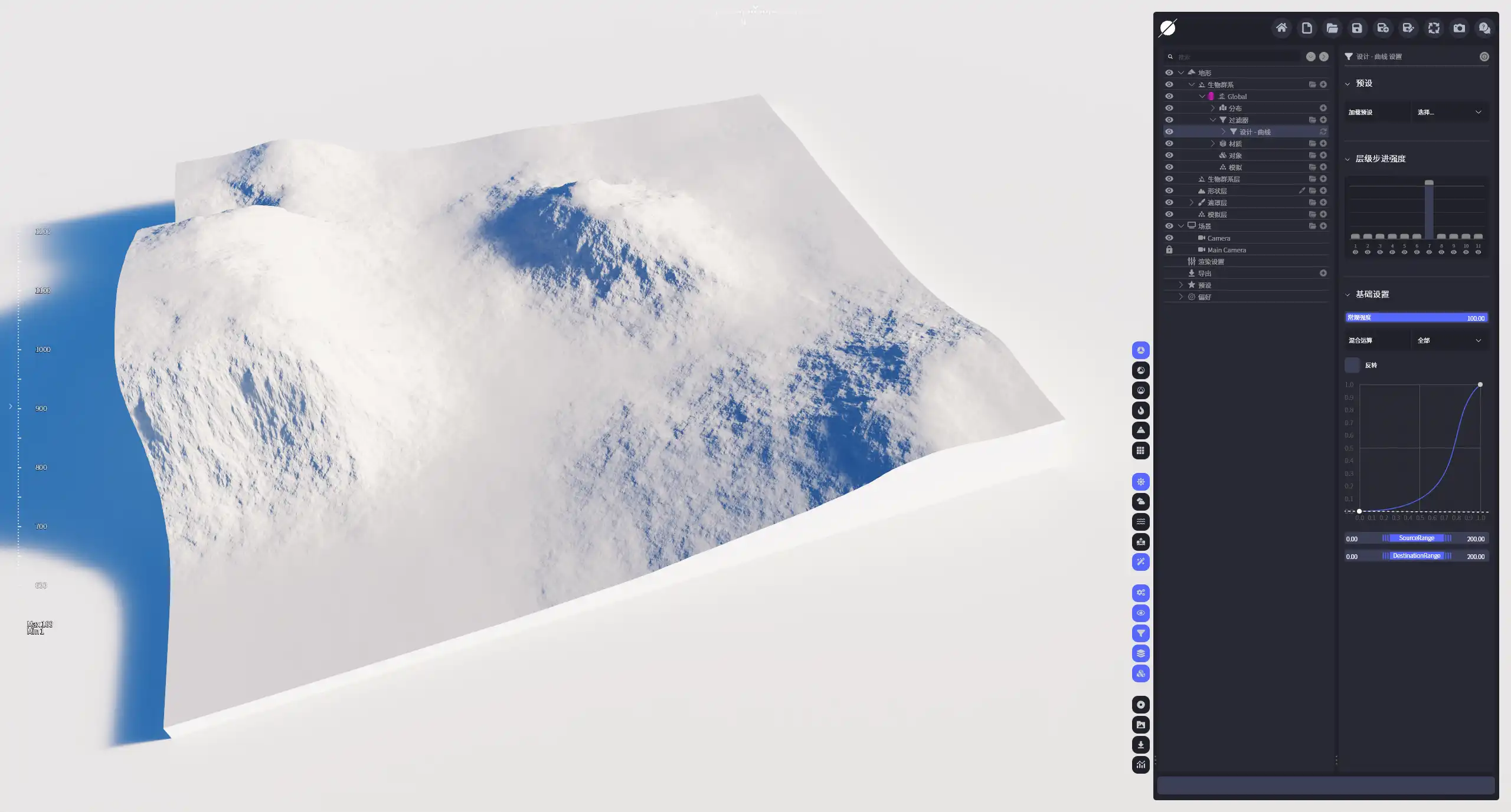 | 曲线图 | 用于修改地形的映射曲线图。可以通过节点的增减,以及控制柄的调整来对曲线线形进行修改,它的x和y轴的范围默认为0-1。曲线的节点是可以增减的,双击任意一个位置,我们可以添加节点,右键点击可以删除节点。节点手柄是以对称的贝兹尔曲线来进行控制的,我们可以通过它来调整曲线的线形,当我们把手柄放到垂直方向上时,会切换成阶梯模式。 |