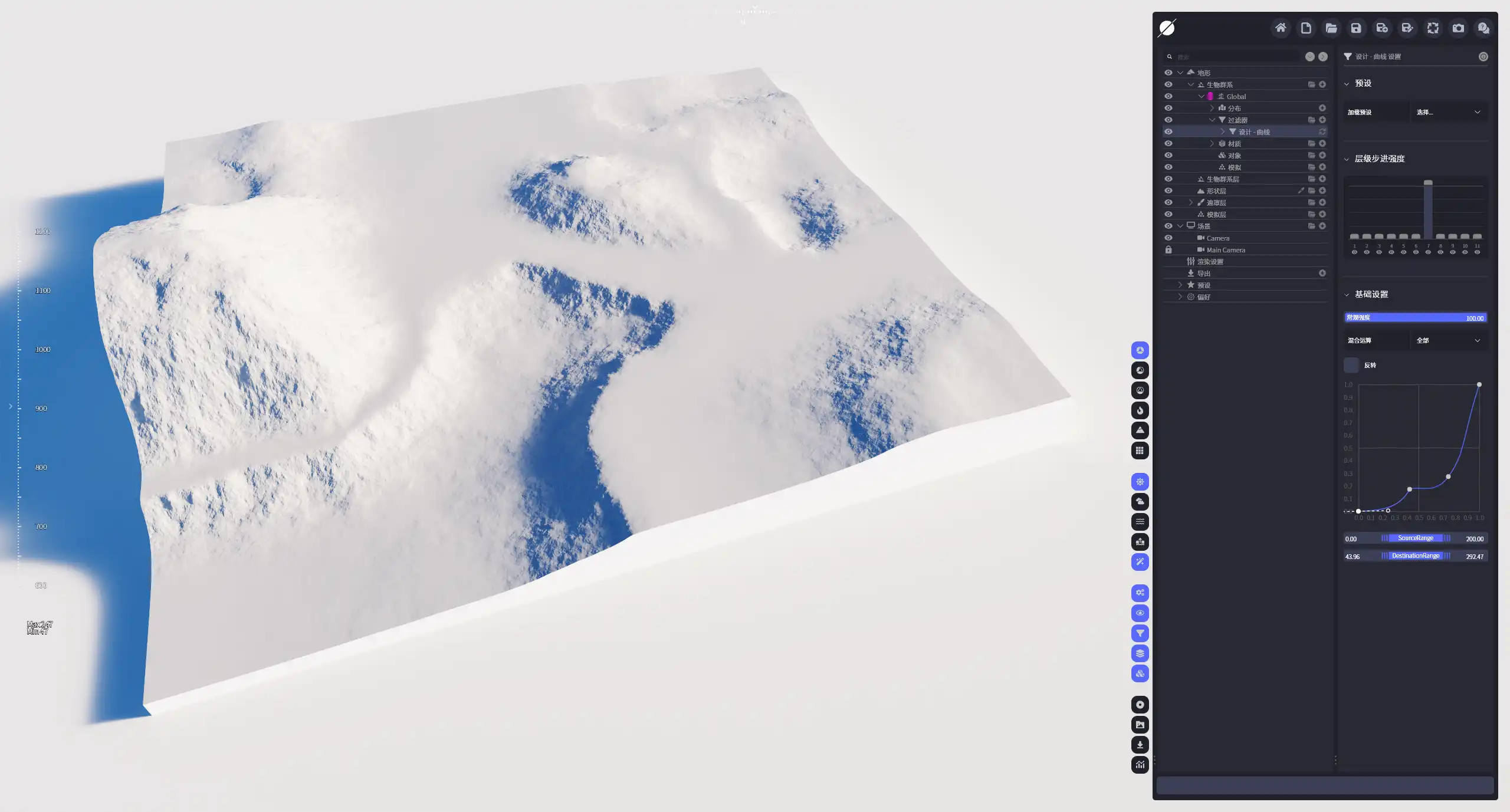 曲线过滤器会将地形高度映射到可编辑的曲线图上,然后通过修改曲线的线形直观地修改地形。类似于Blender当中的Map Range节点,或者是Grasshopper中Graph Mapper的作用。即把原地形高度映射到0-1之间,进行归一化处理,然后归一化的高度数据会映射到这条曲线上面,然后我们可以通过编辑曲线的线形来调整地形高度数据的整体走势。
