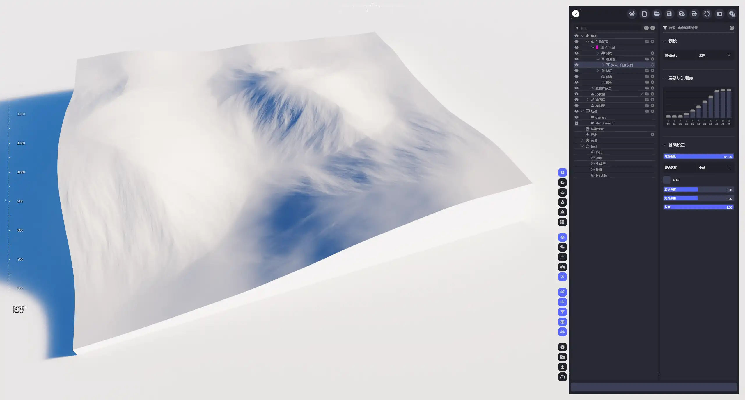 基本模糊效果会沿着地形表面向下的方向产生冲刷的效果,同时它还允许我们沿模糊方向挤压或推出地形,这个过程中层级步进强度的选择会产生决定性的影响。它可以用于为地形添加模糊效果,或是增加局部下凹或凸起的细节。