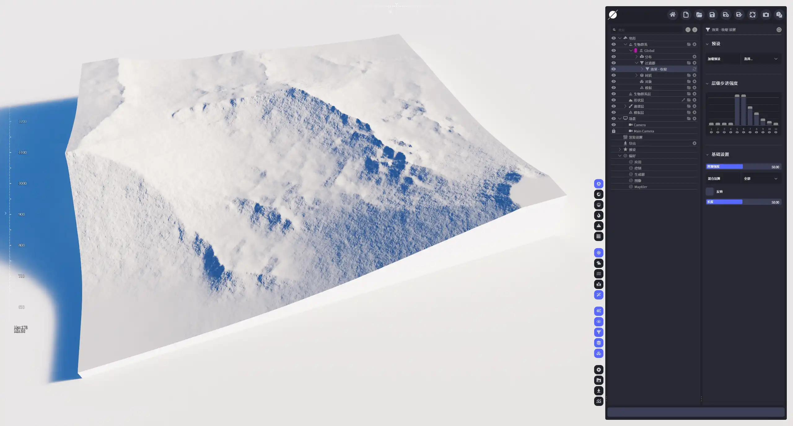 直译过来是放气的意思,可以让地形产生瘪下去的效果。这个过滤器主要是用来修形,比如需要让山脉的山脊更加锐利,可以考虑使用这个过滤器;它也可以用来塑造类似沙丘的形态。