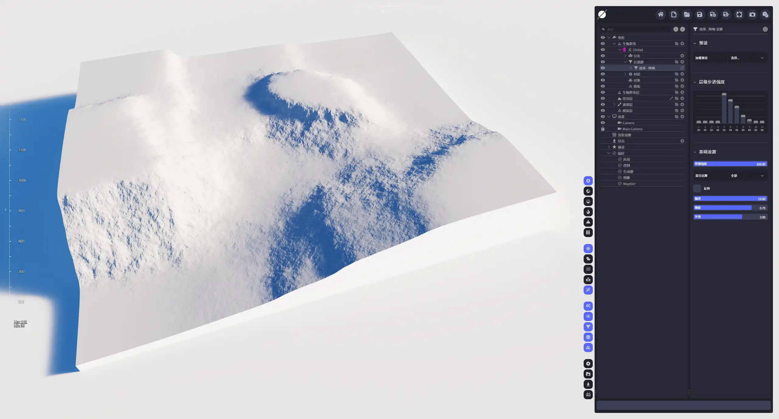 | 阈值 | 噪波的检测阈值,更大的值会生成更大规模的降噪效果,类似于步长的概念。据我们所设置的阈值不同,降噪过滤器会在不同的高度分别进行降噪处理,看到当参数值设置得比较小的时候,会呈现更细密的台阶效果;反之这种特征效果尺度会增大。 |