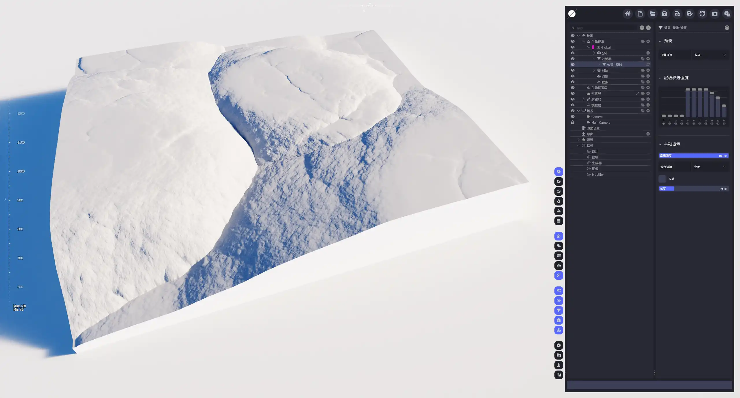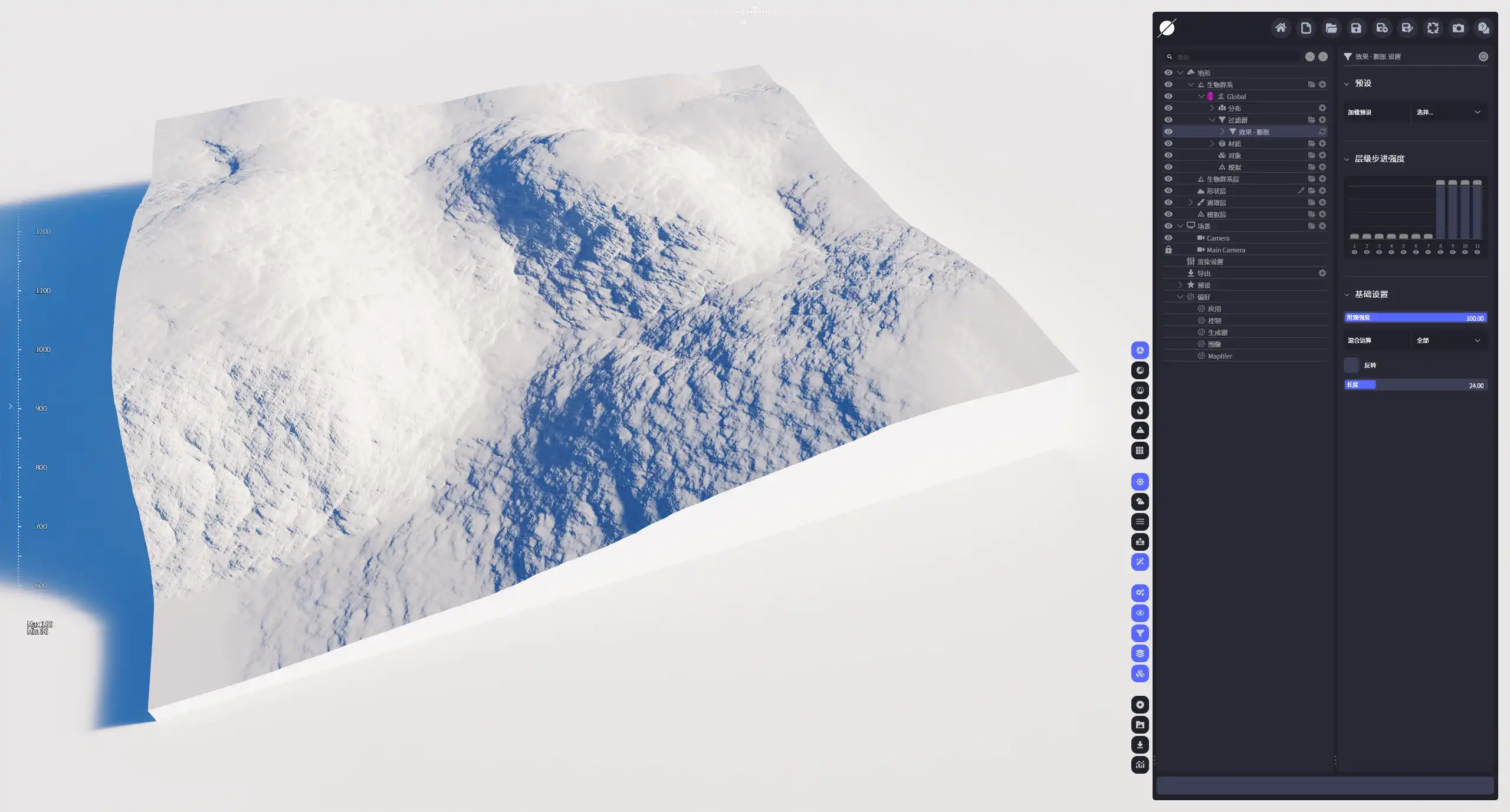 在有明显坡度的区域产生像素位移,向外挤压产生类似充气的效果。和Deflate的原理类似,但并不是简单的反向操作。和Balloon相比,充气效果对地形坡度的改变会更加显著,地形顶部会趋向于平整而不是球形。膨胀过滤器经常用于改变岩石形态结构,让整体效果变得更加饱满。