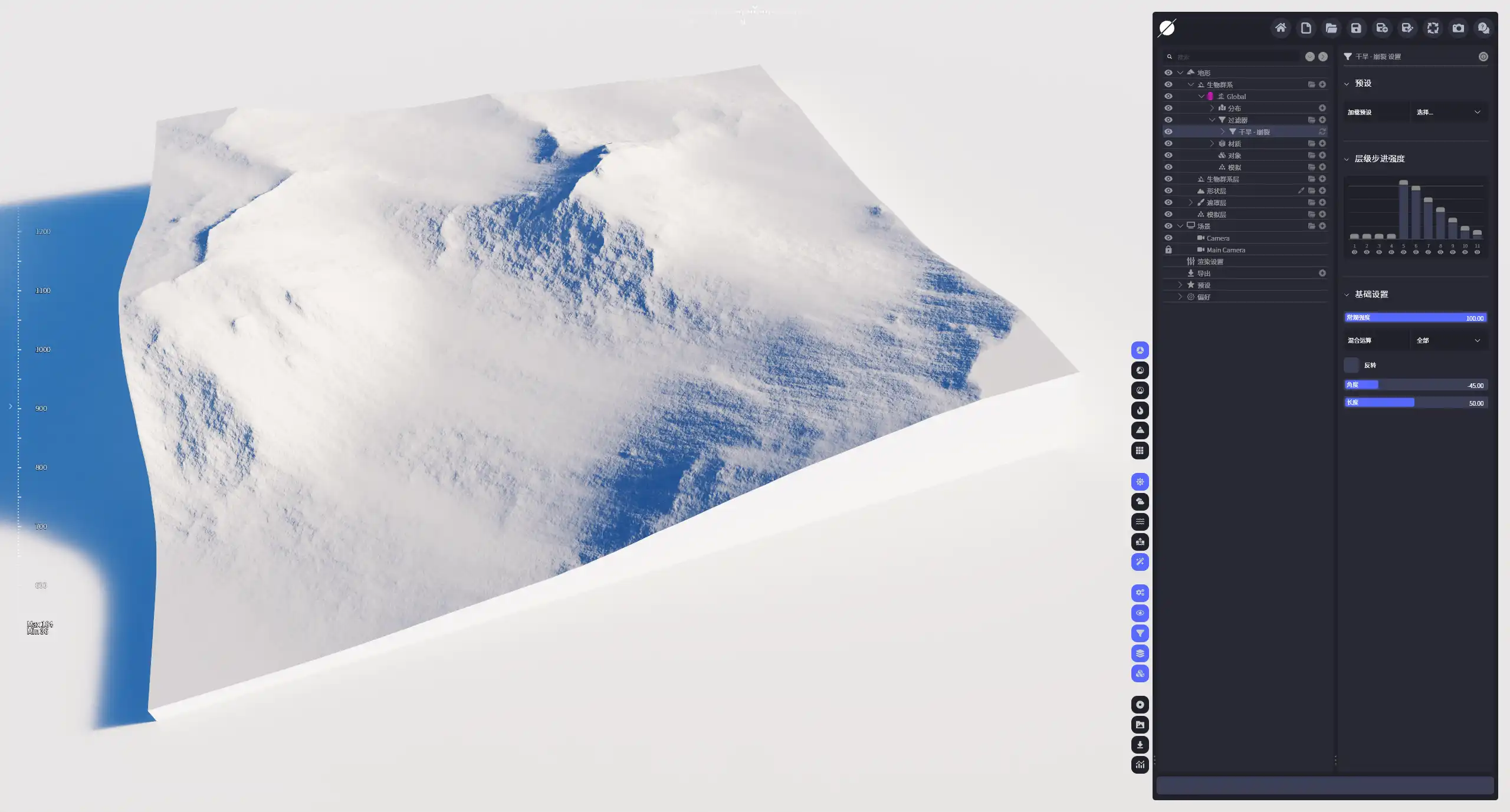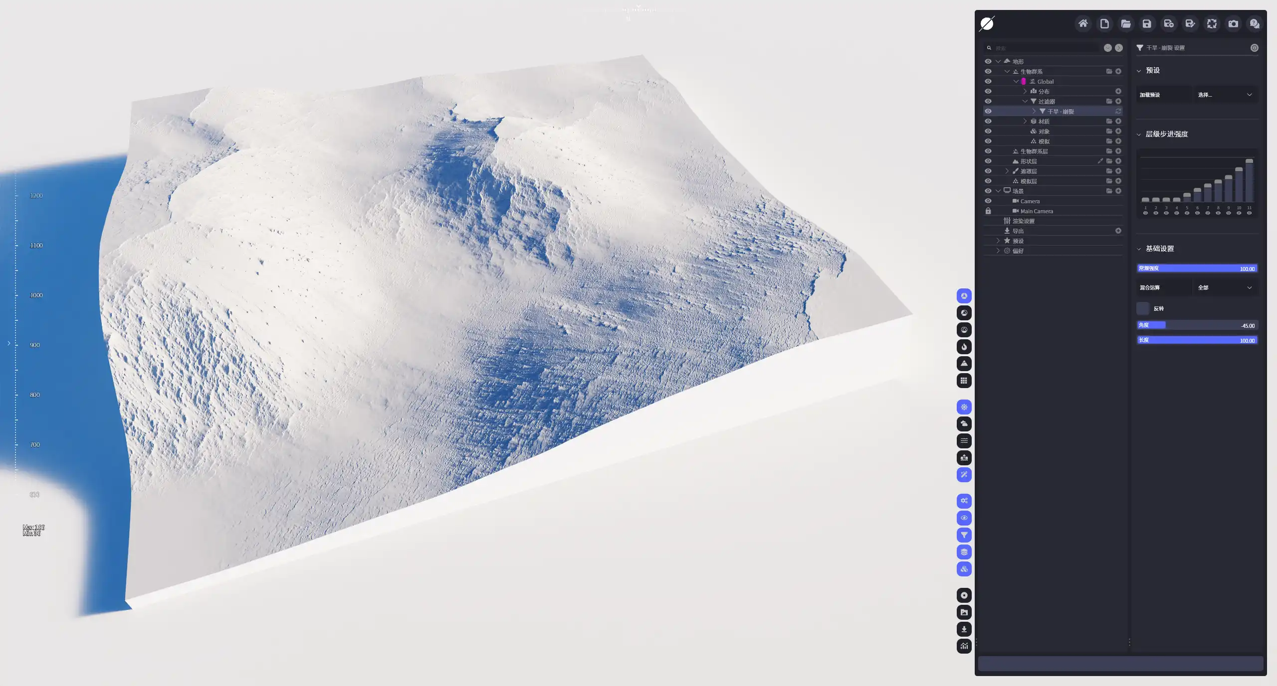 崩裂过滤器和挤压过滤器类似,都会在地形上生成褶皱结构,同时地形的上部会有被挤压而成的破碎效果。崩裂过滤器的不同在于当长度参数增大的时候,地形会生成明显的断裂特征,所以相比之下它对原始地形的改变会更加的剧烈。