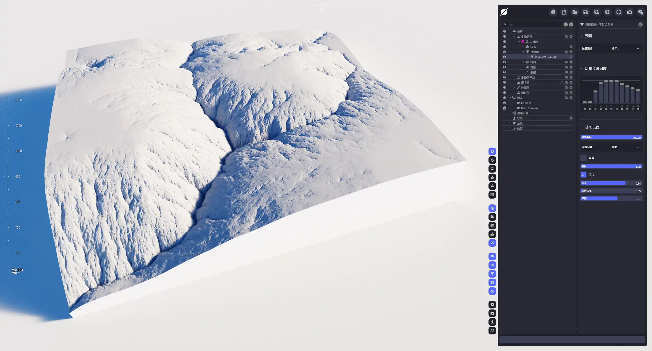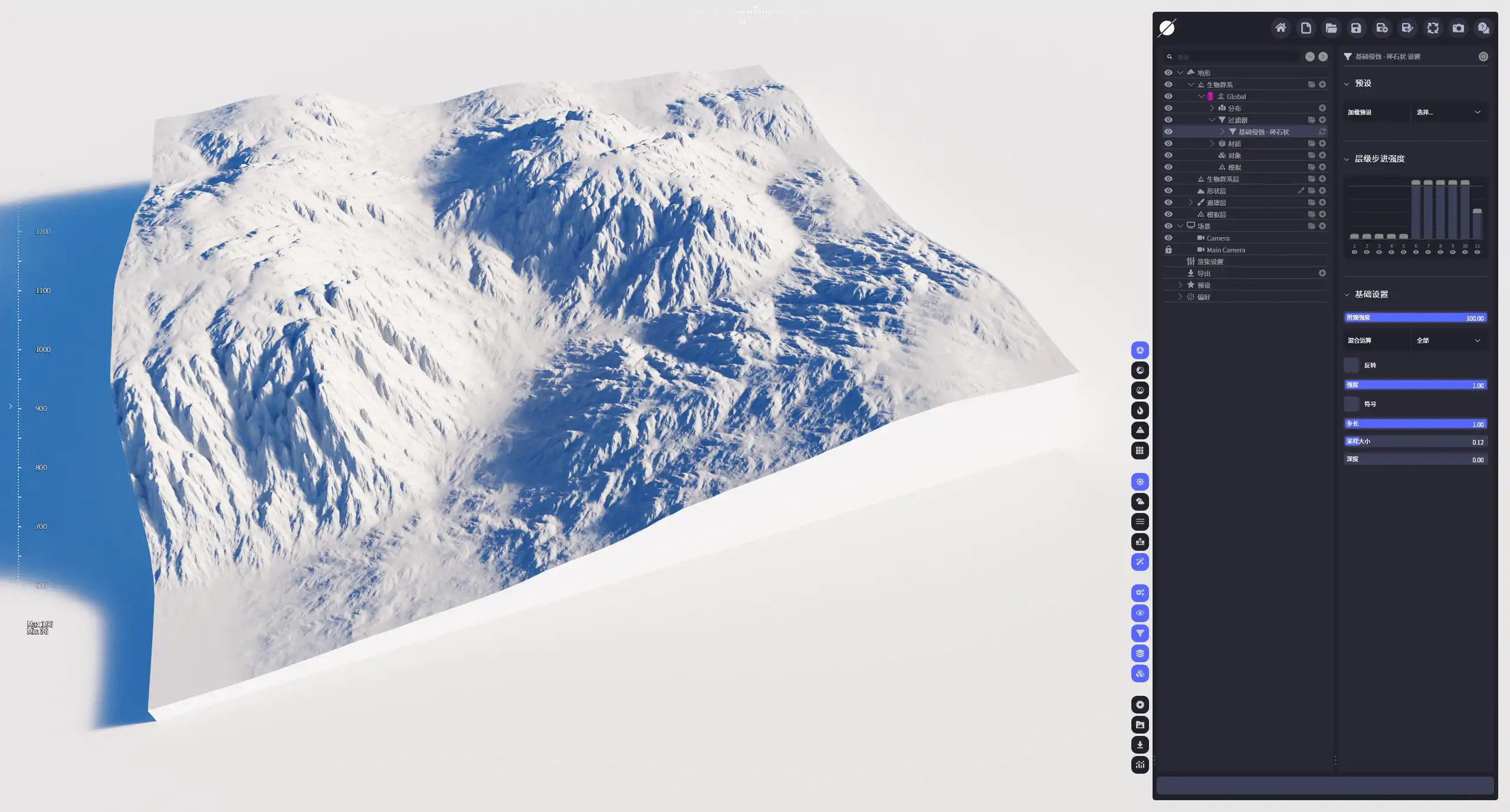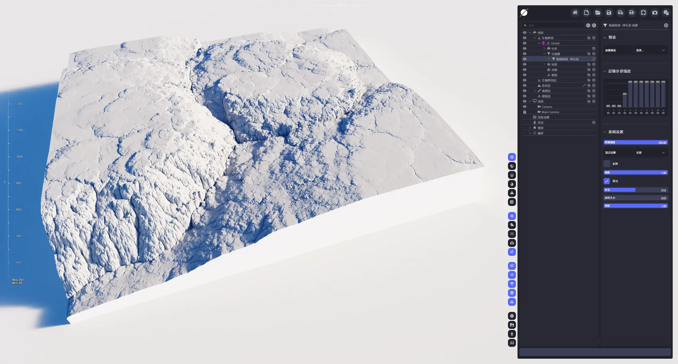 相比于其他侵蚀过滤器,岩石状过滤器采用了截然不同的算法,参数非常简洁,但是却能创造多种不同的效果。它的基本作用机制是在一定的采样精度下,将地形像素向上方移动,从而产生类似岩石的效果,同时通过深度参数下压岩石周围像素,将生成效果强化。结合层级步进强度以及符号和反转选项,可以生成多种形态的地形效果。