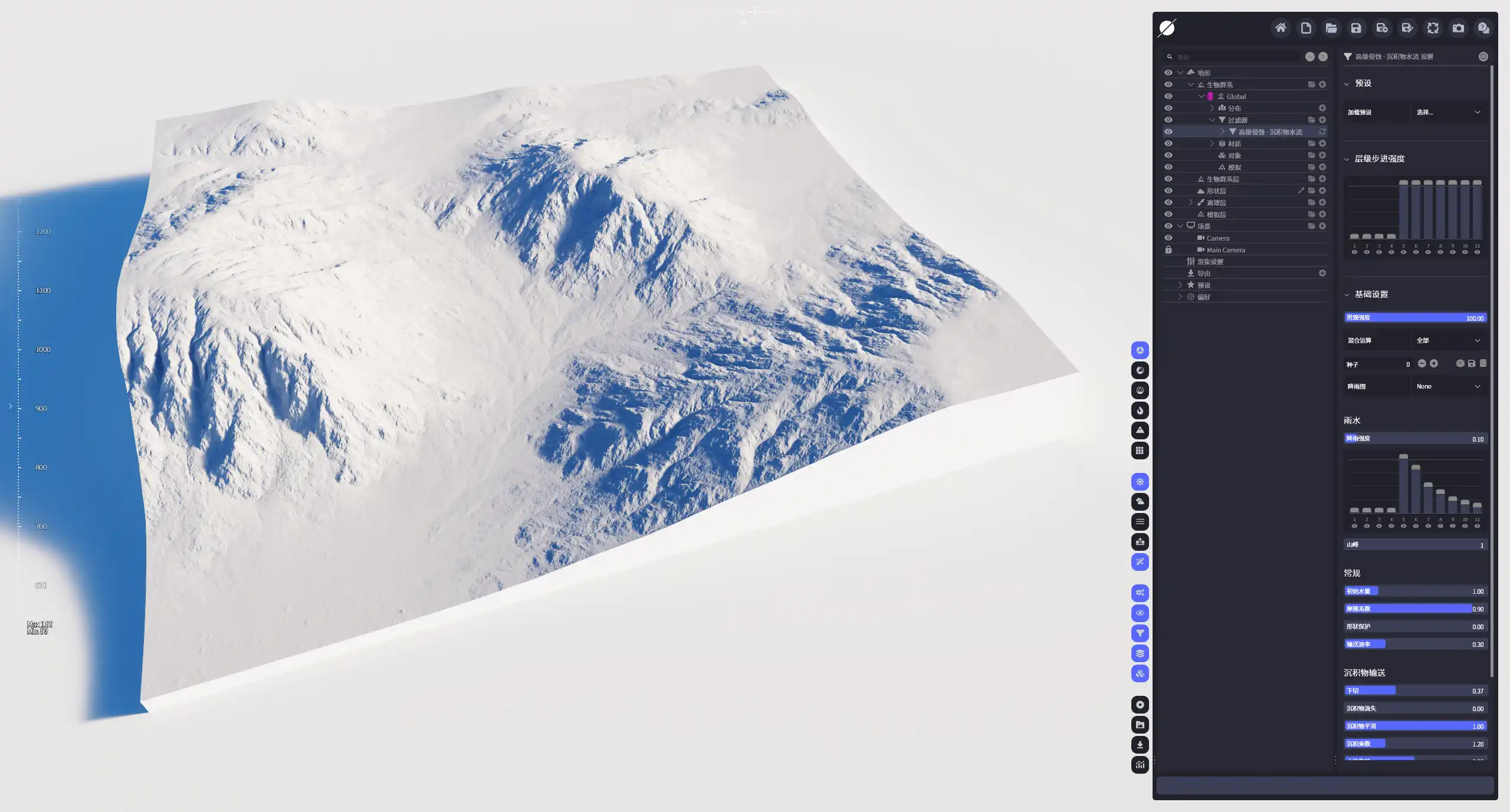 最重要的侵蚀过滤器,没有之一。它的算法是非常先进的,运算速度也明显优于宽大水流和细小水流。这个过滤器主要表现在山体因为侵蚀作用的局部坍塌,以及沉积物的不规则颗粒,它能够更好地模拟真实世界的侵蚀细节和沉积物细节。