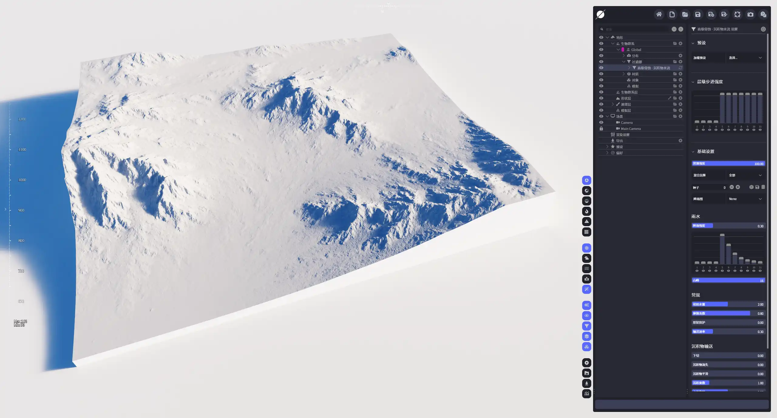 | 降雨层级步长强度 | 在不同的层级步进对雨量大小进行控制,较低的级别会生成更加宽大的侵蚀凹槽以及更大规模的侵蚀效果。 |