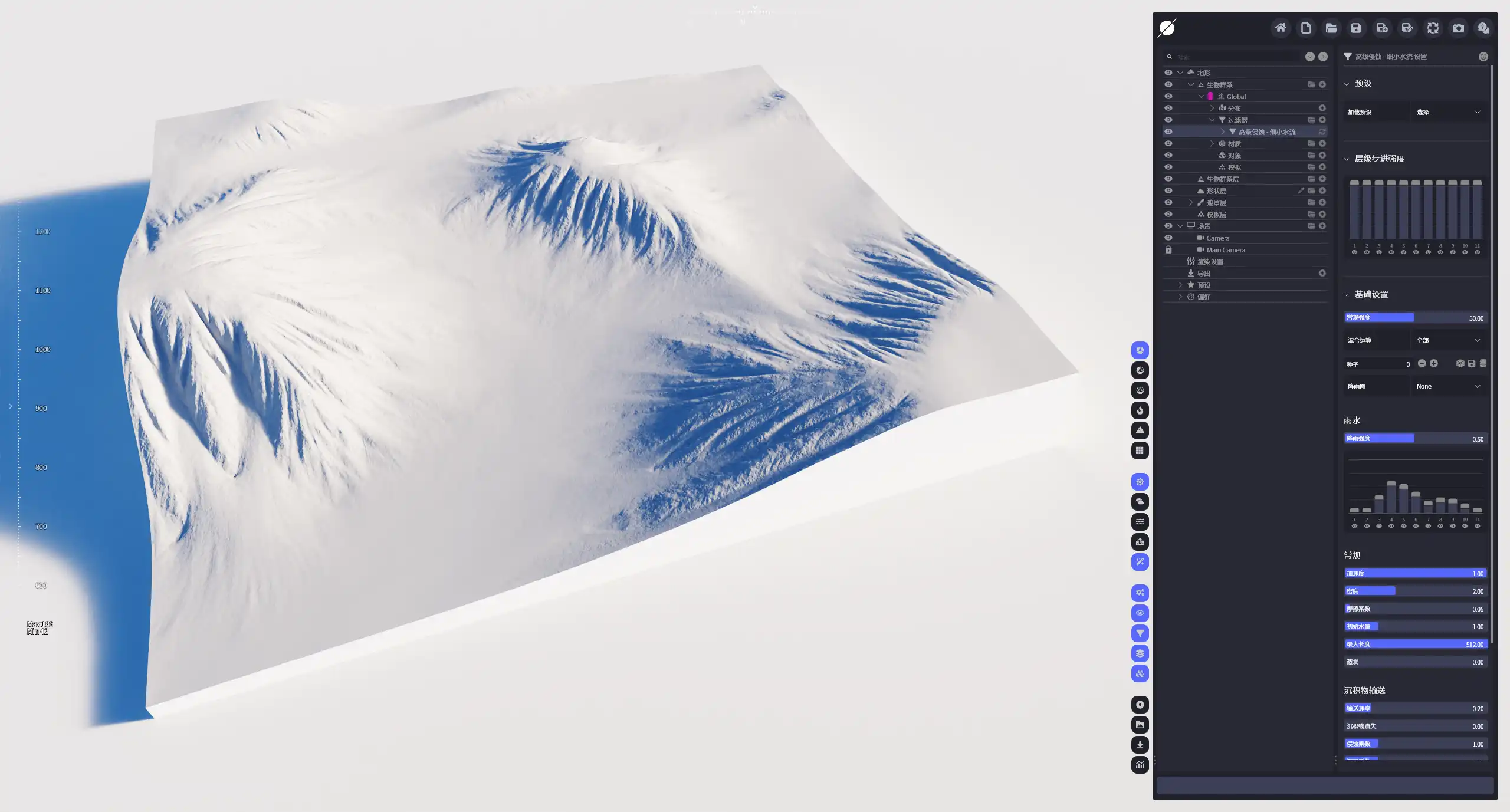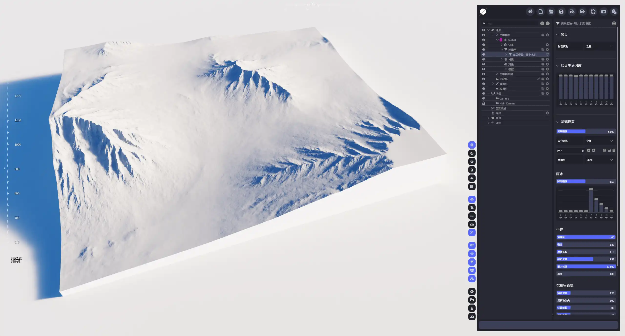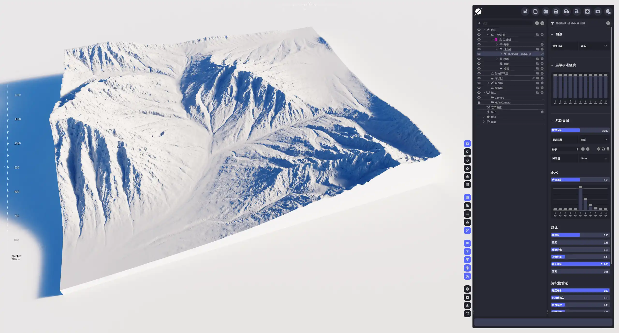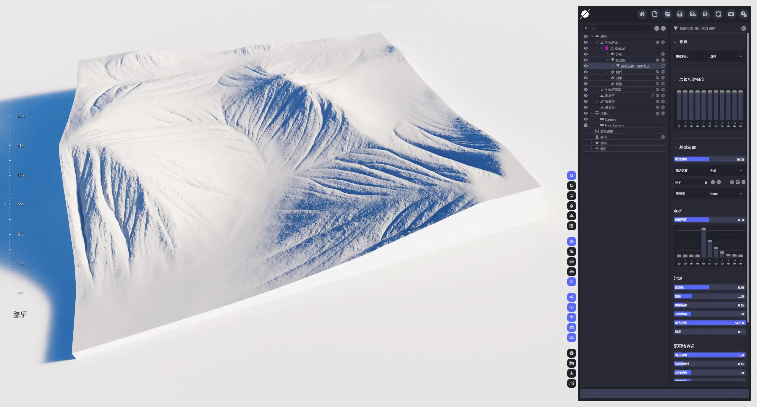| 降雨层级步长强度 | 在不同的层级步进对雨量大小进行控制,较低的级别会生成更加宽大的侵蚀凹槽以及更大规模的侵蚀效果。 |