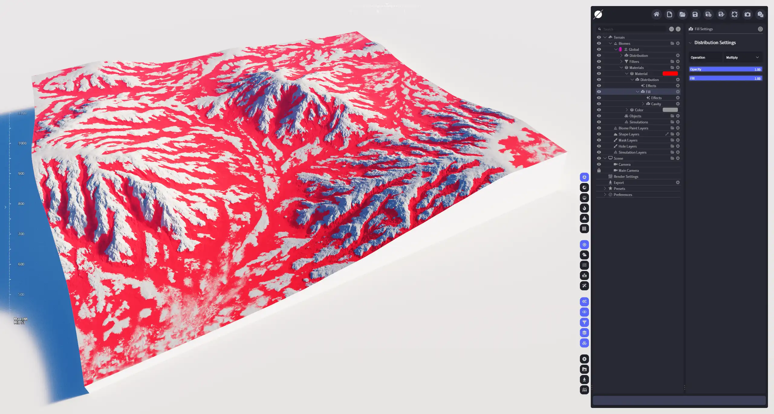 用于调整处理后材质的透明度。它和一级 分布 列表中的填充参数作用一致,用于直接调整其子分布的输出值,即材质的透明度。可以嵌套其他分布作为子分布。
