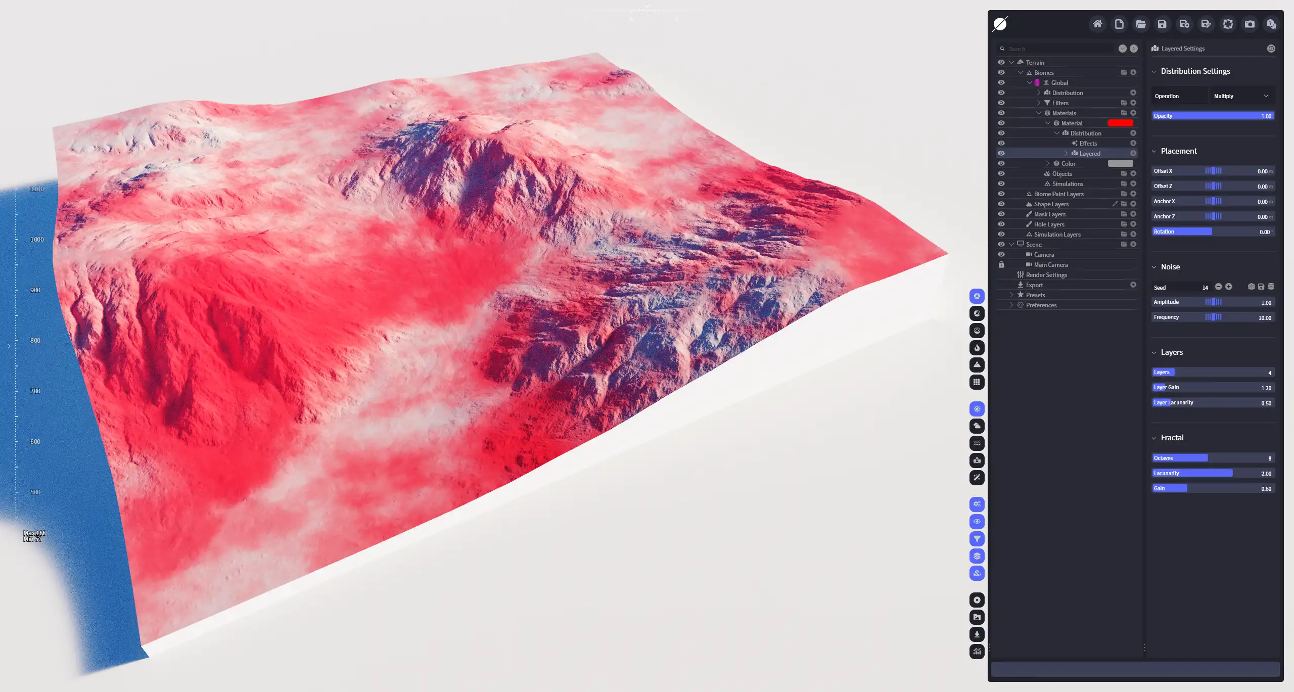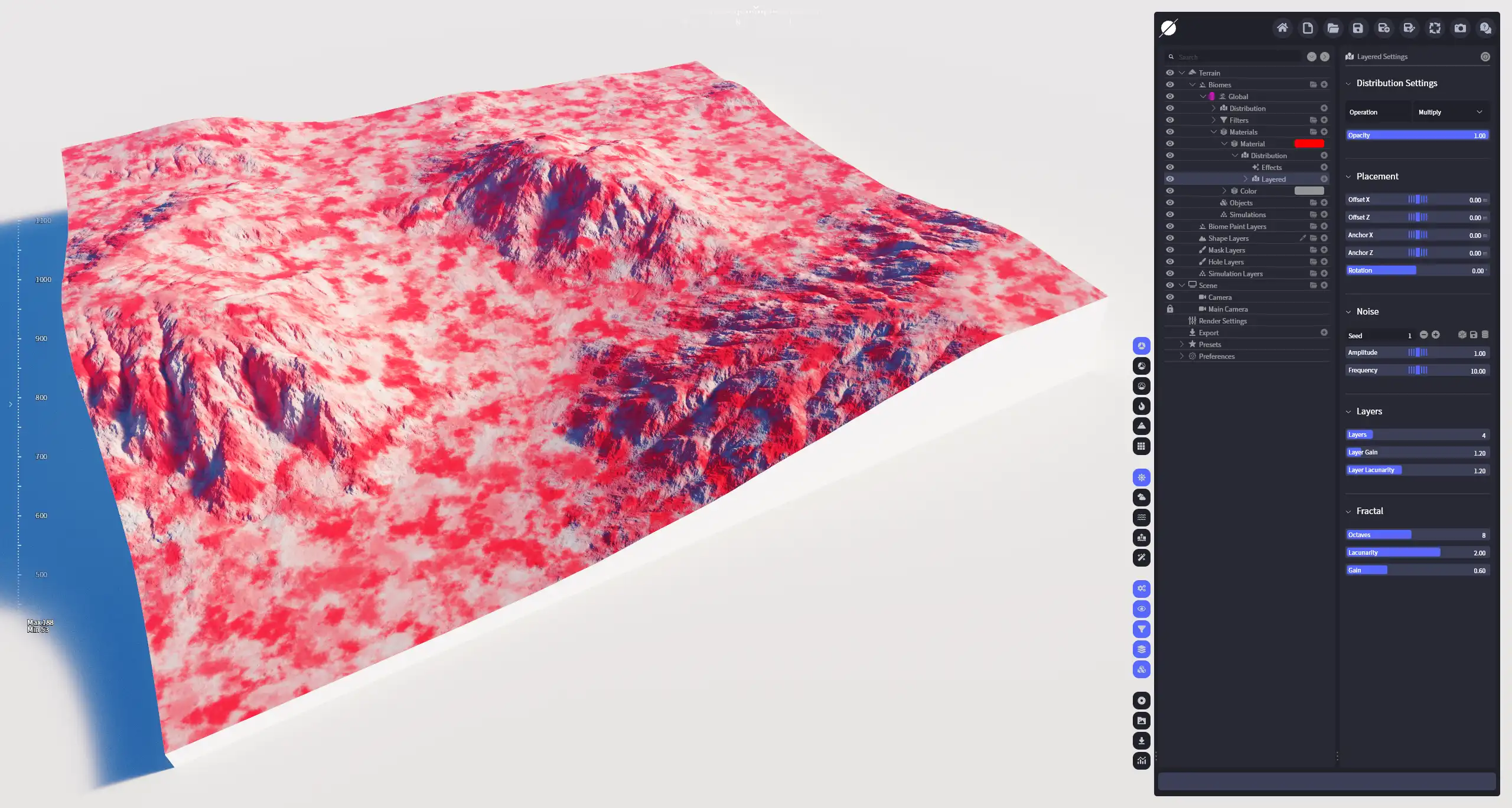2025.3加入的一个强大的噪波分布。普通分形噪波(FBM)采用迭代的方式生成噪波图形,每一个 倍频程 的频率和振幅都严格依赖于它的上层噪波,其结果呈现明显的自相似性。分层噪波 则采用非迭代的方式,通过引入不同的噪波层生成,用于创建非自相似的、高度异质的复杂噪波分布,这种效果在自然界中更为常见,如不同表面效果的侵蚀地貌、植被的分布等。