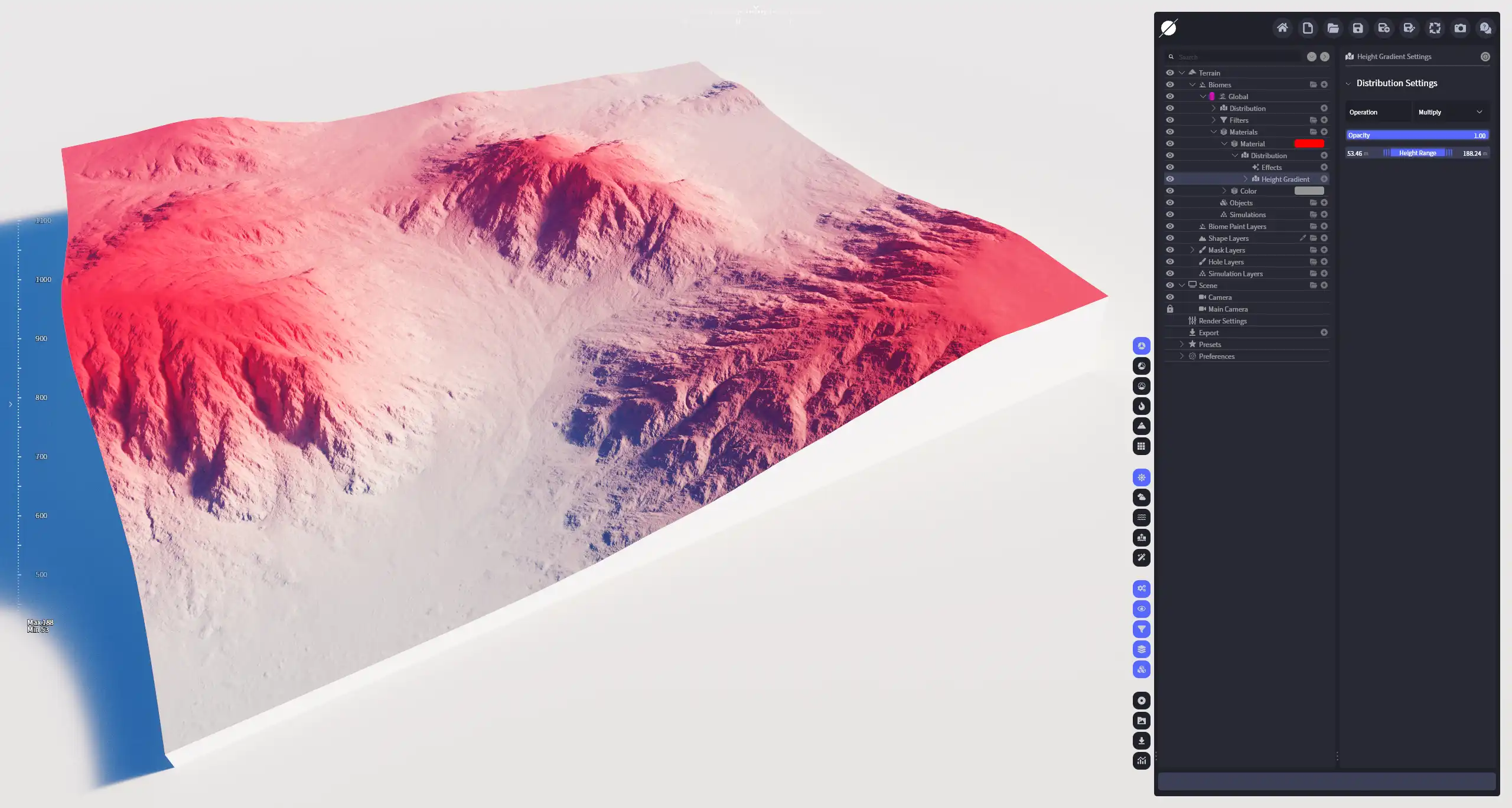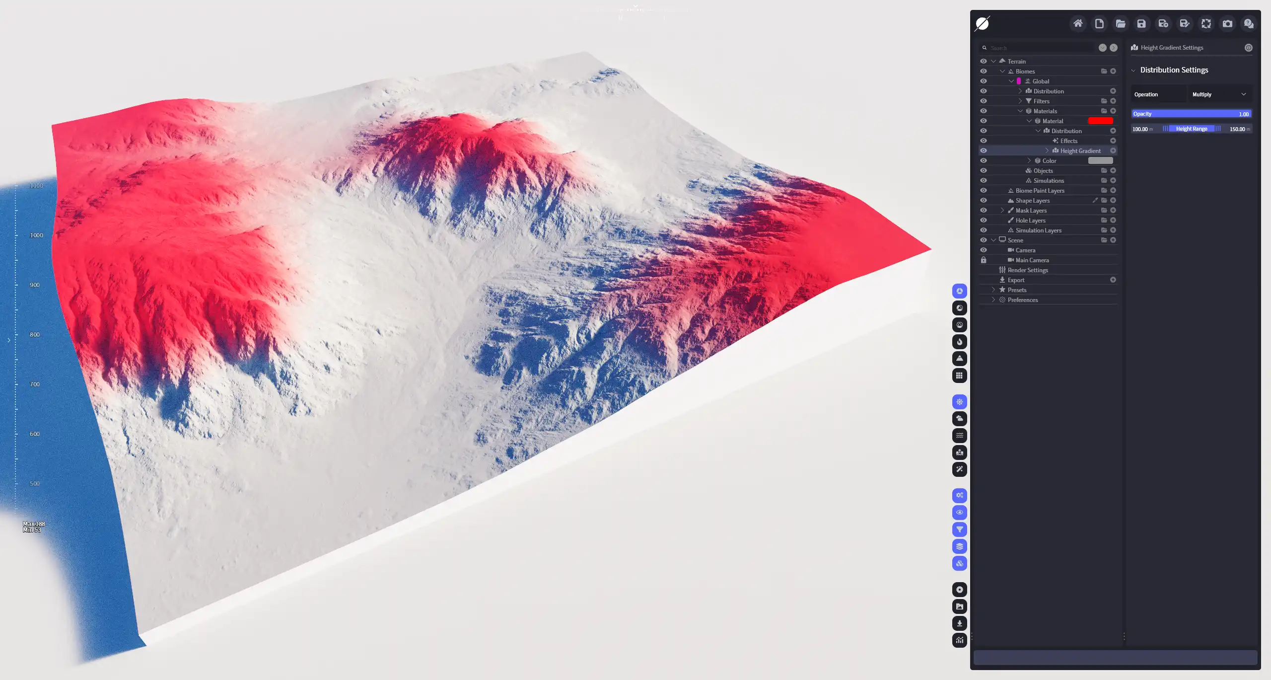 分布指定的高度渐变区域,默认状态下,左侧数值对应地形的低位海拔高度,右侧数值对应地形的高位海拔高度,在这个区间的分布图像映射值为0-1;当地形高度低于左侧数值的区域判定为0,高于右侧数值的区域判定为1。这个分布可以快速选取地形的上部或下部区域(应用