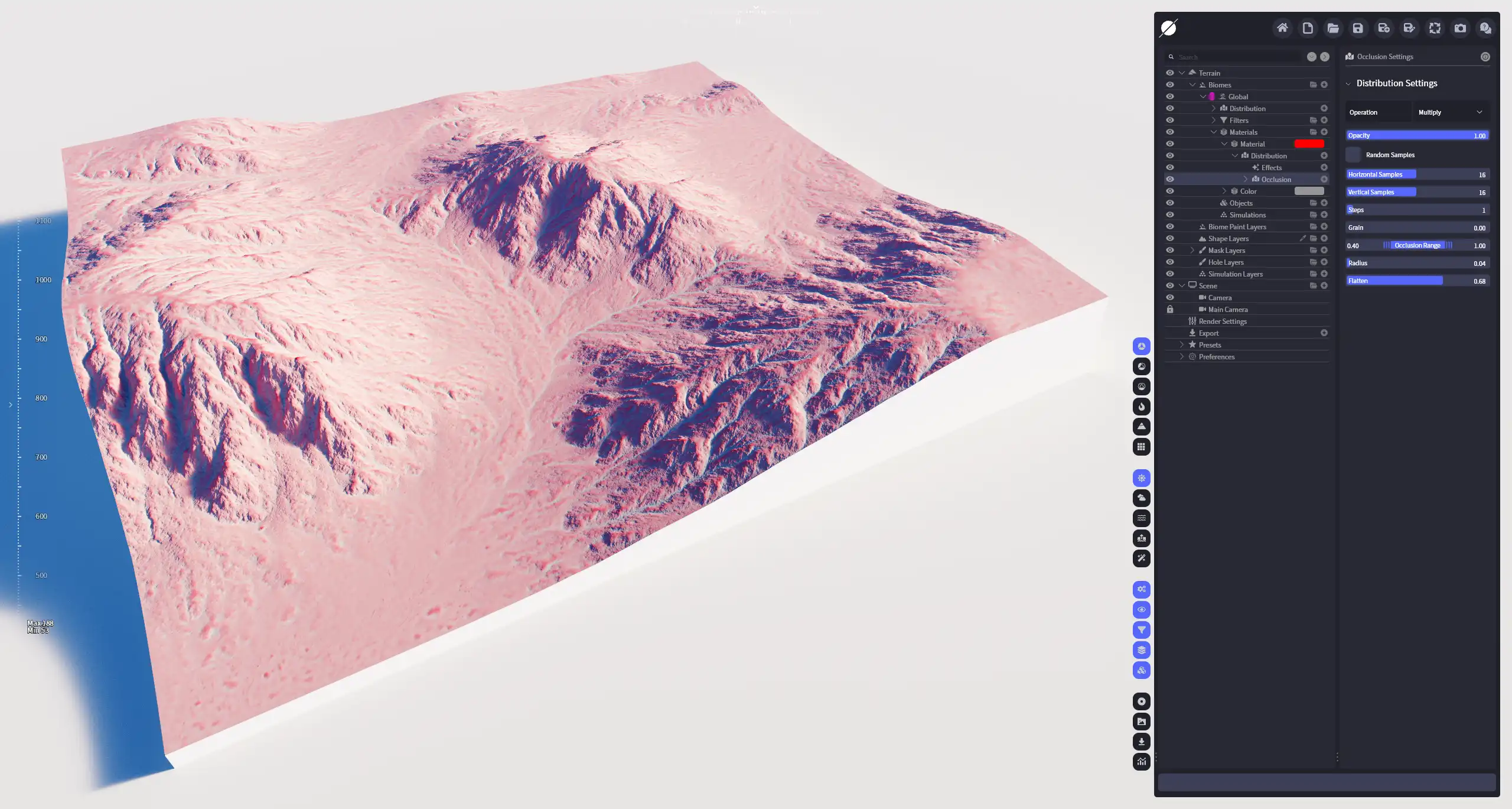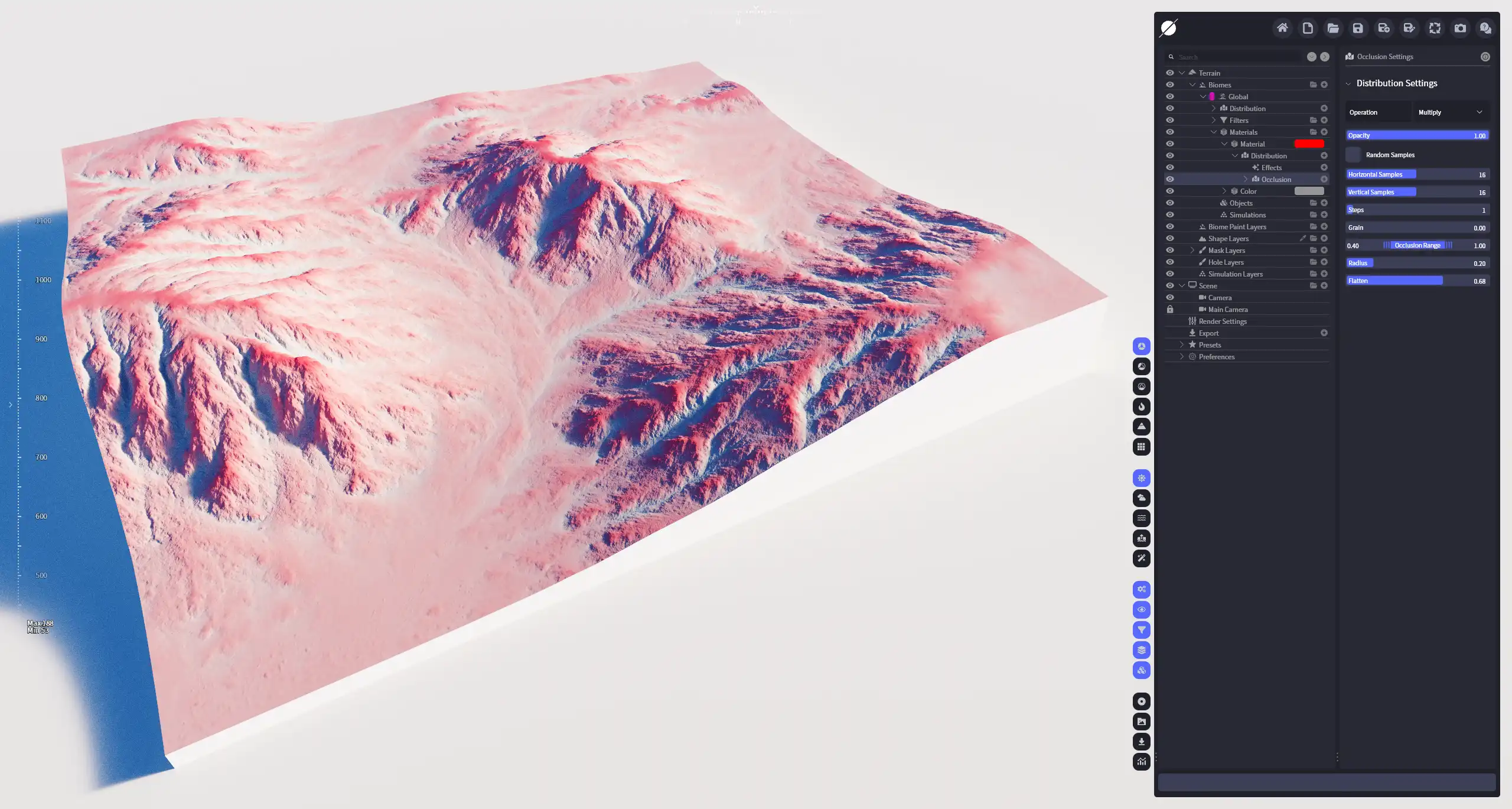 2024版加入的一个强大的分布算法。遮挡分布类似于环境光遮蔽贴图,在其他DCC软件中多用于和纹理贴图结合使用的AO贴图,用于加强物体凹陷区域的几何细节,有助于提升光照效果的真实感。遮挡分布在World Creator中主要用于指定尘土和污垢的区域,通常是地形凹陷区域以外的其他地方,实际生成效果和直接光照无关。遮挡分布依赖于高效的实时生成算法(SSAO),简单来讲,它按照可分离的遮挡采样以及模糊降噪的步骤实现。可用于山体上的草皮、苔藓等分布处理。