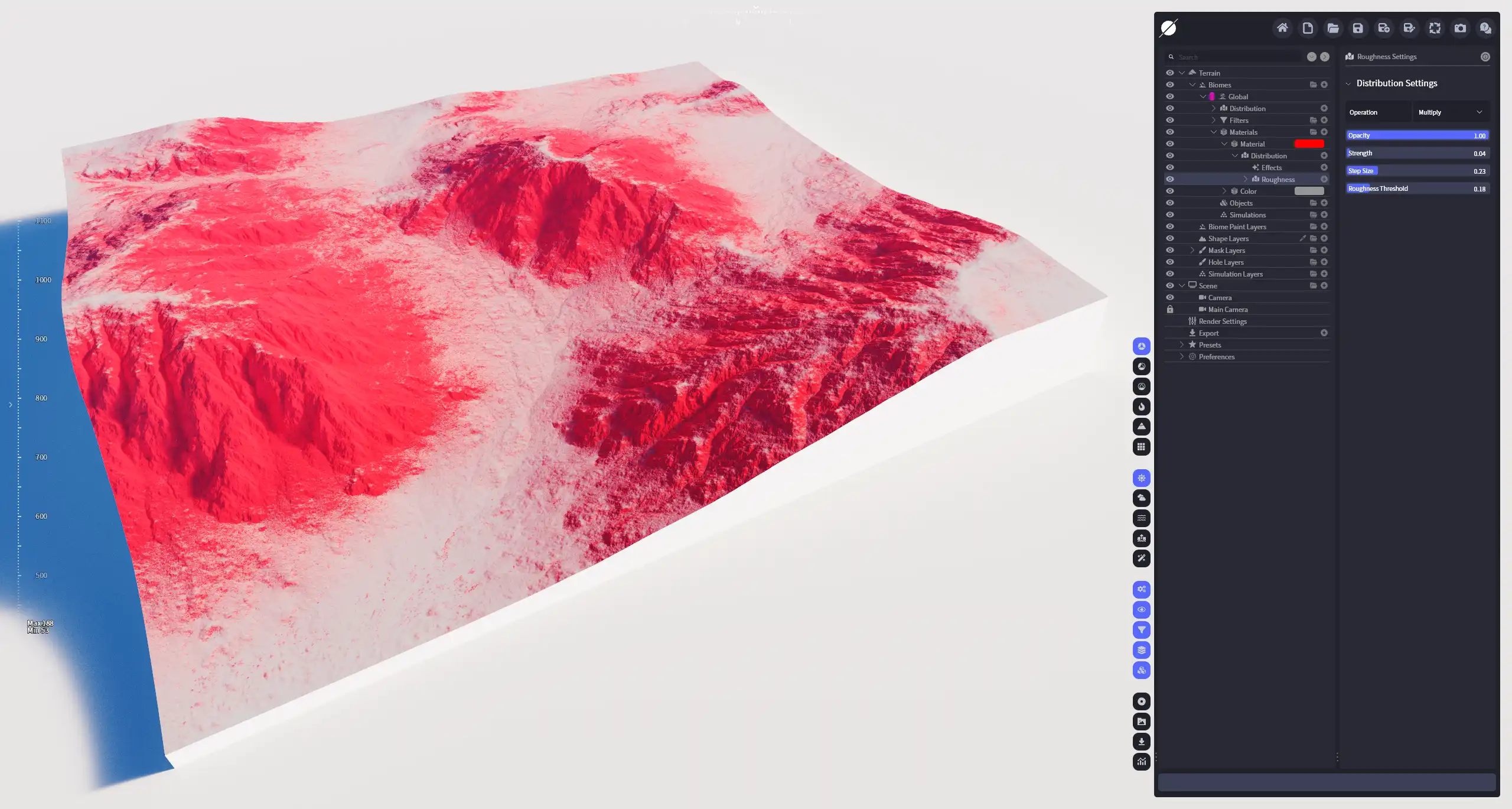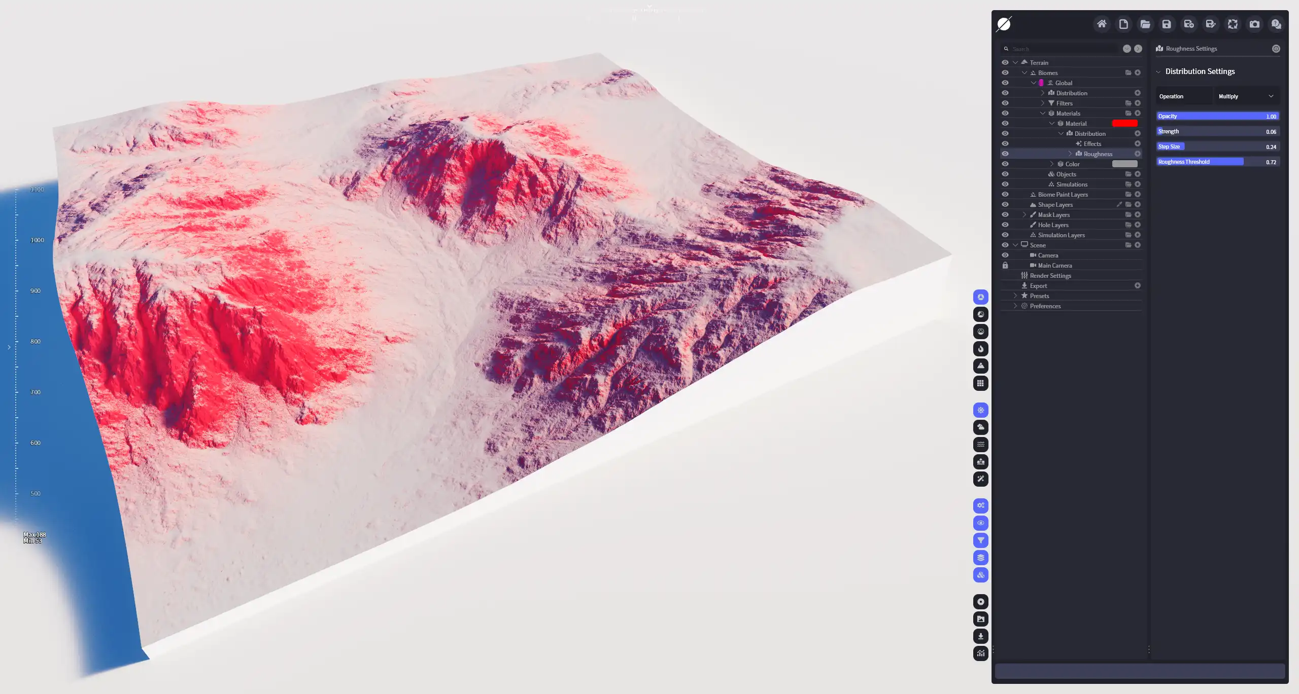 选择地形中较粗糙区域中坡度较大的区域,相对于 坡度 分布,粗糙度 分布在坡度变化区域有更加细腻的效果表现,可用于选择地形中的岩石部分。