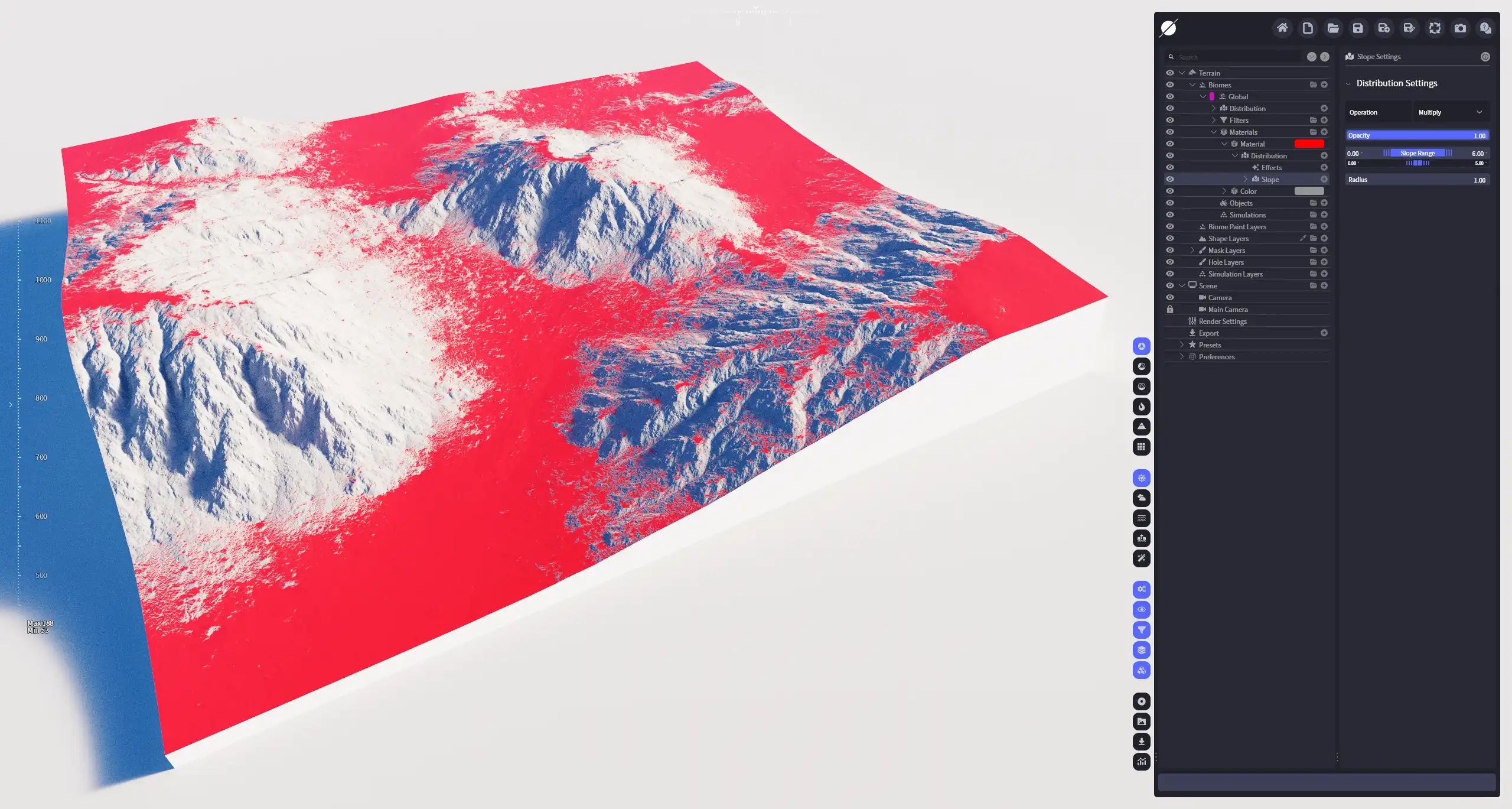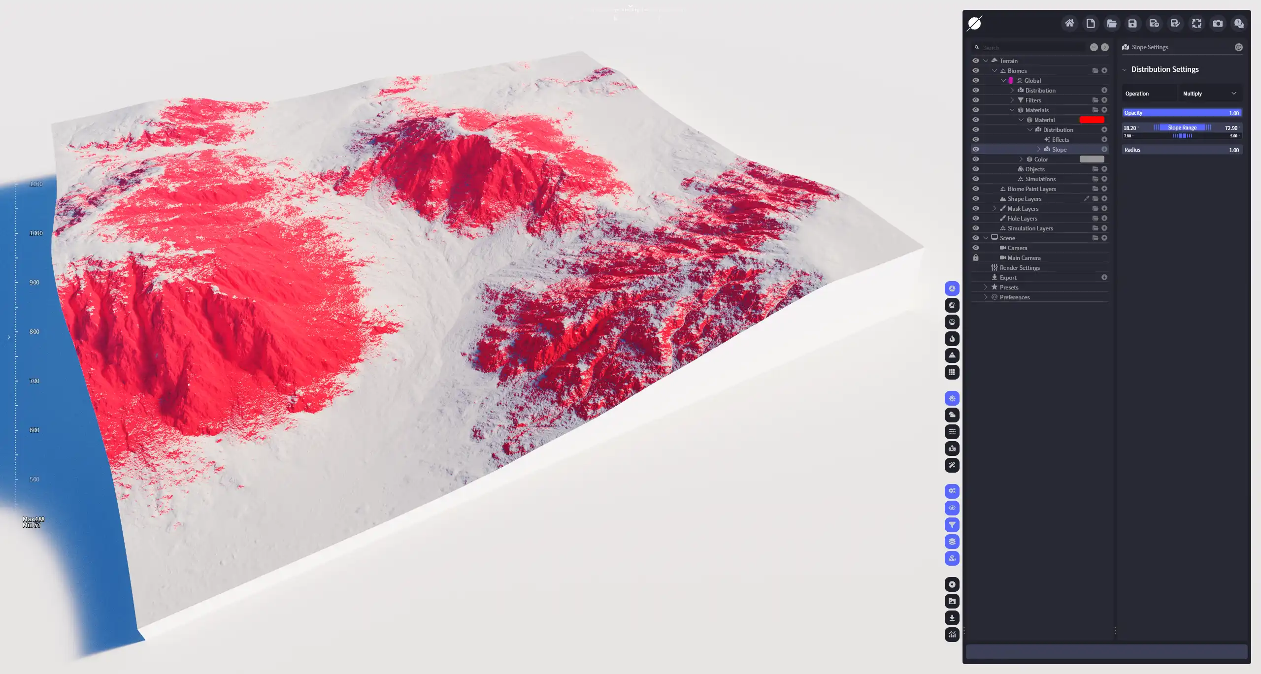 根据地形像素所在的坡度创建选择区域。应用于过滤器时,如果选择区域有太强的颗粒感,可以考虑增大 半径 值,或者加入 模糊 效果。