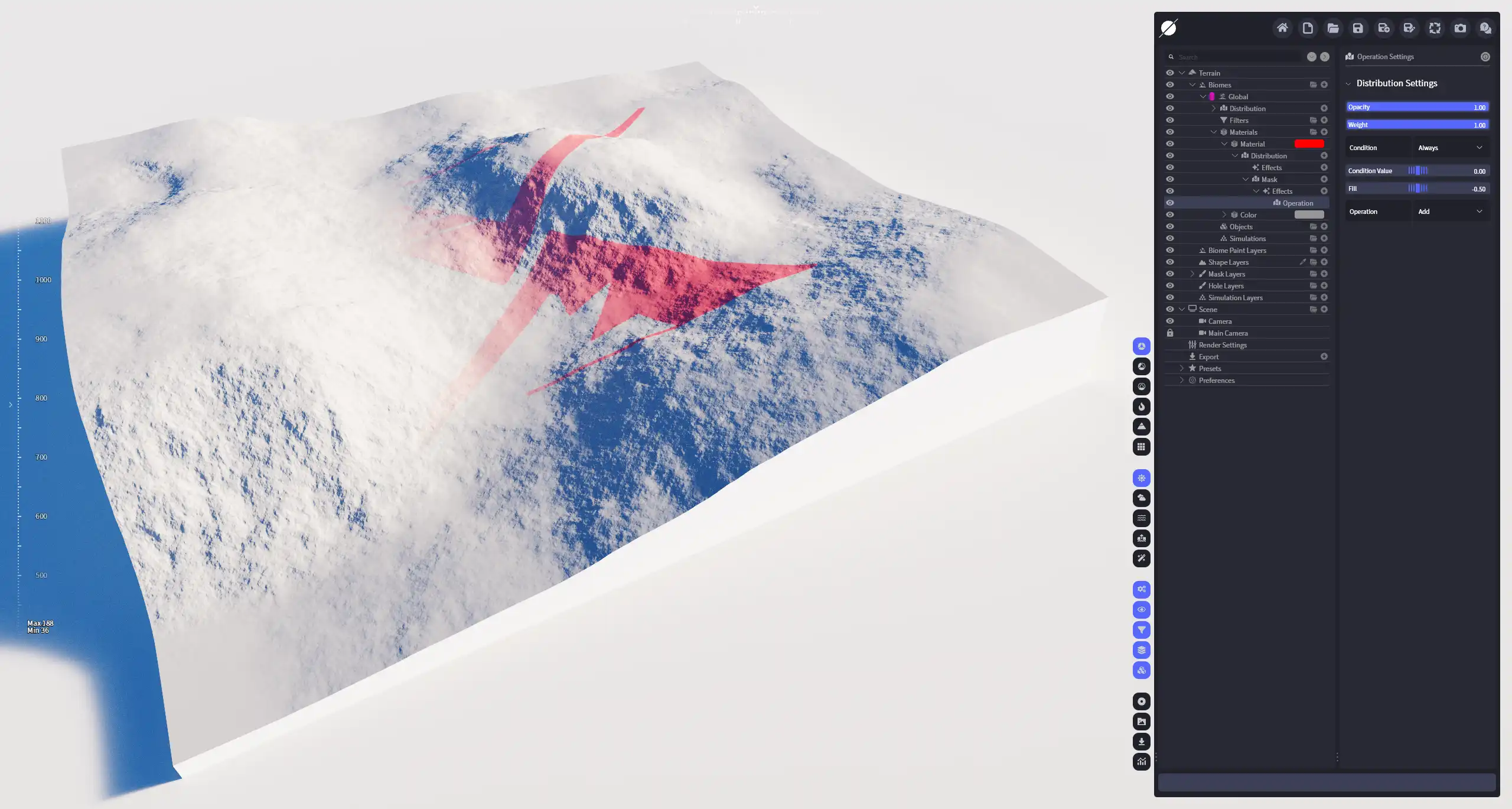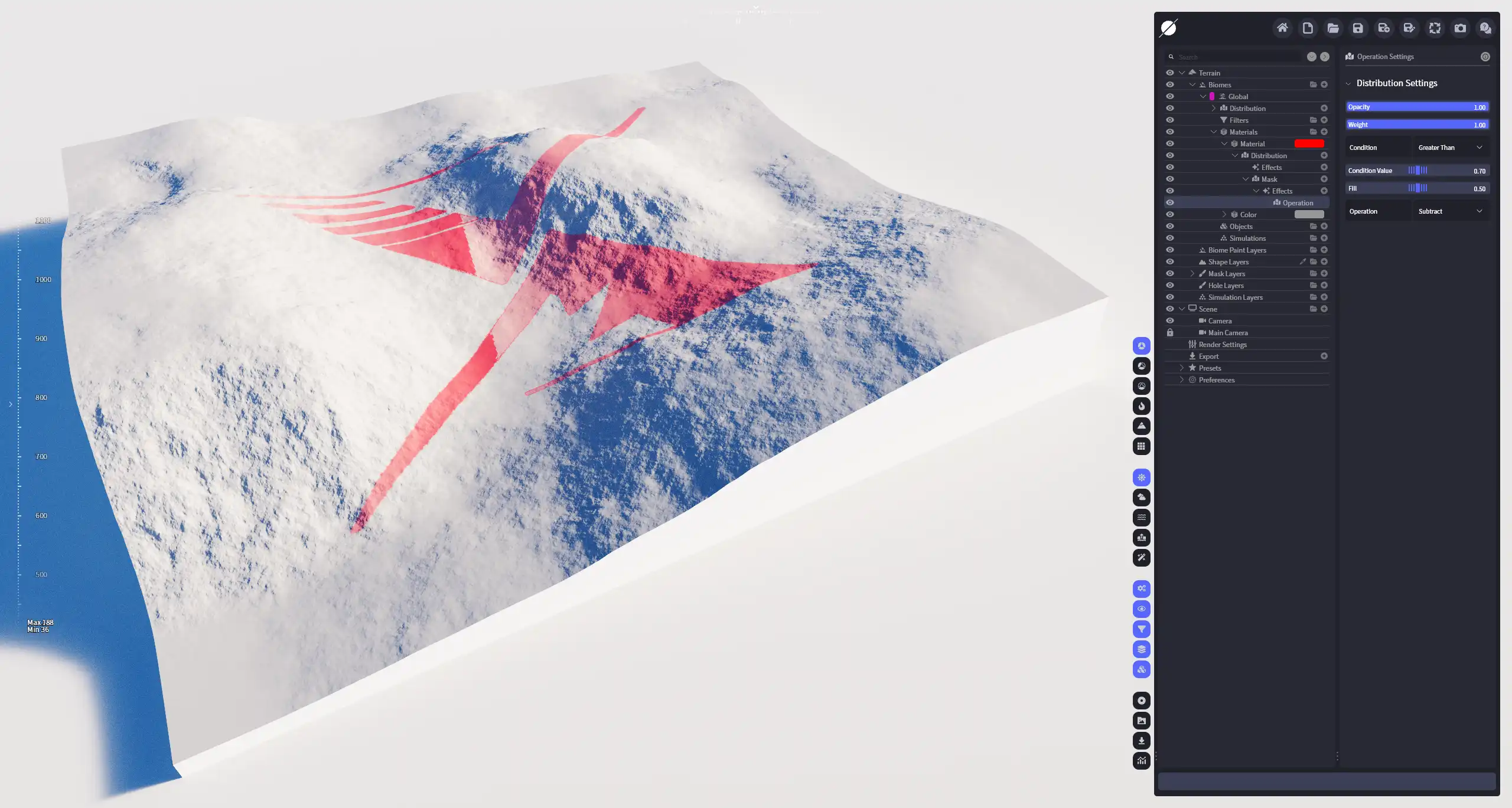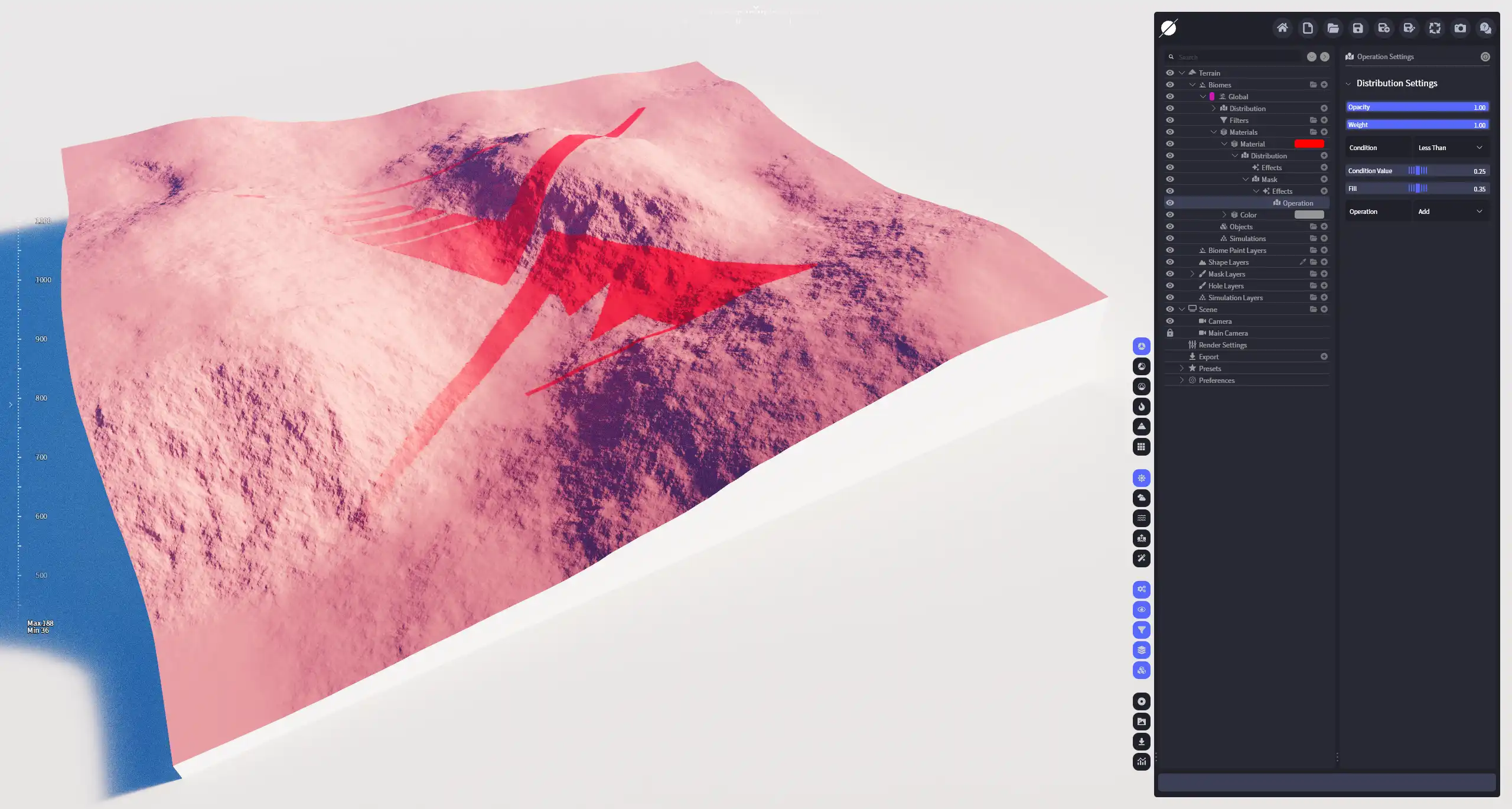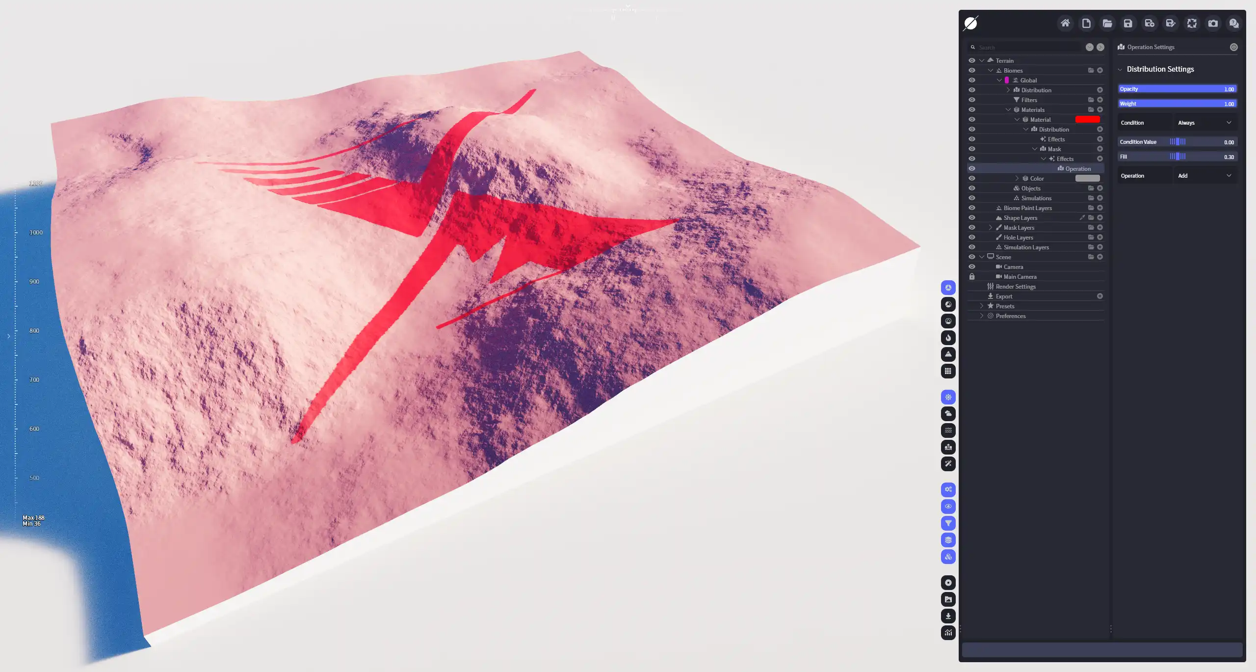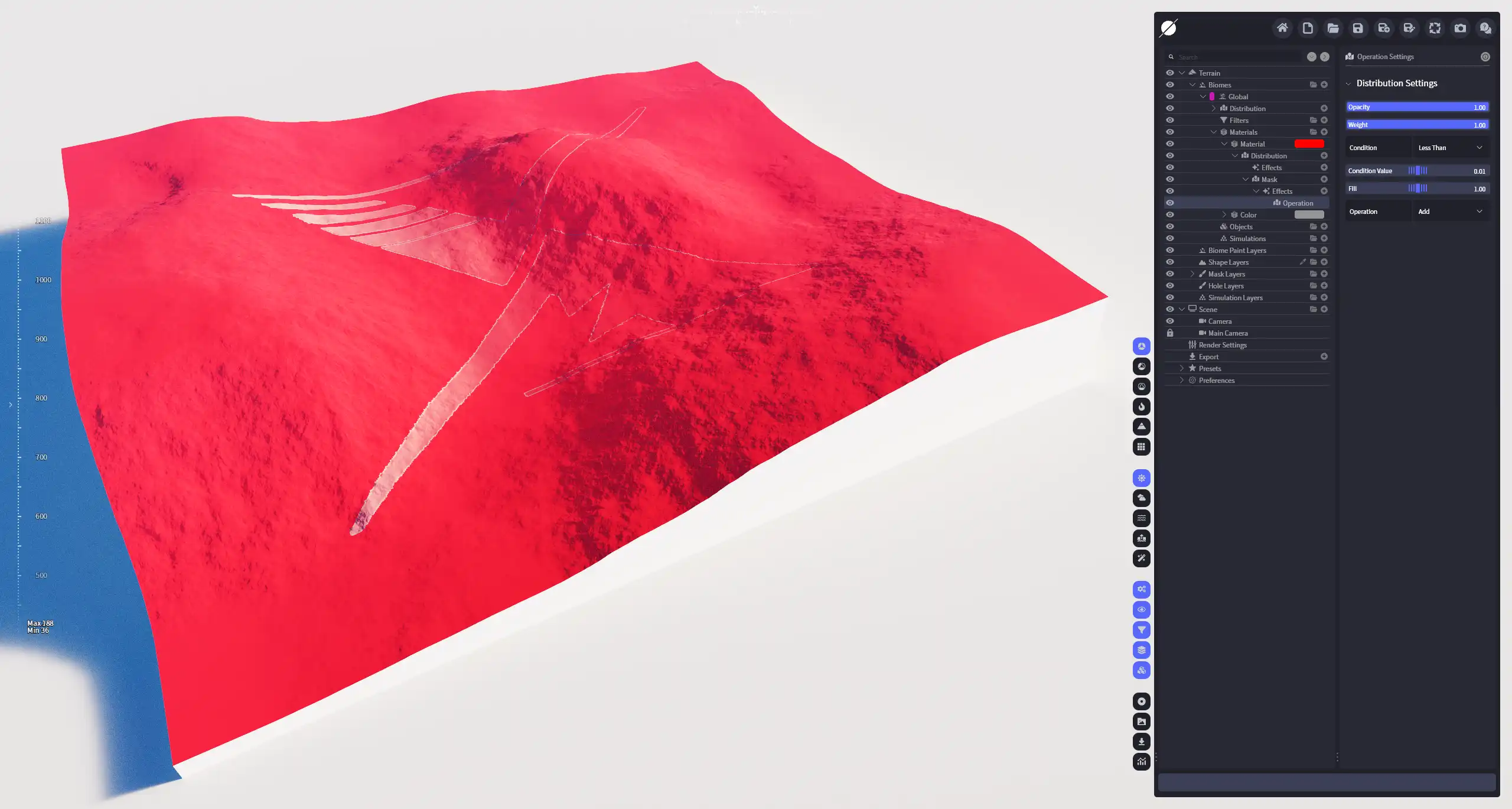 利用设定的条件对分布不同数值的选区进行指定的运算,符合条件的选区会纳入计算范围。也就是说,整个步骤分两步进行:选择符合条件的区域 ⇒ 对指定区域代入运算。条件运算后,分布区域会被分为两部分,符合条件的区域(结果为true),代入运算;不符合条件的区域(结果为false),保持不变。此效果可以对分布图底进行整体运算,也可以用于精确处理分布中的高值或低值部分。