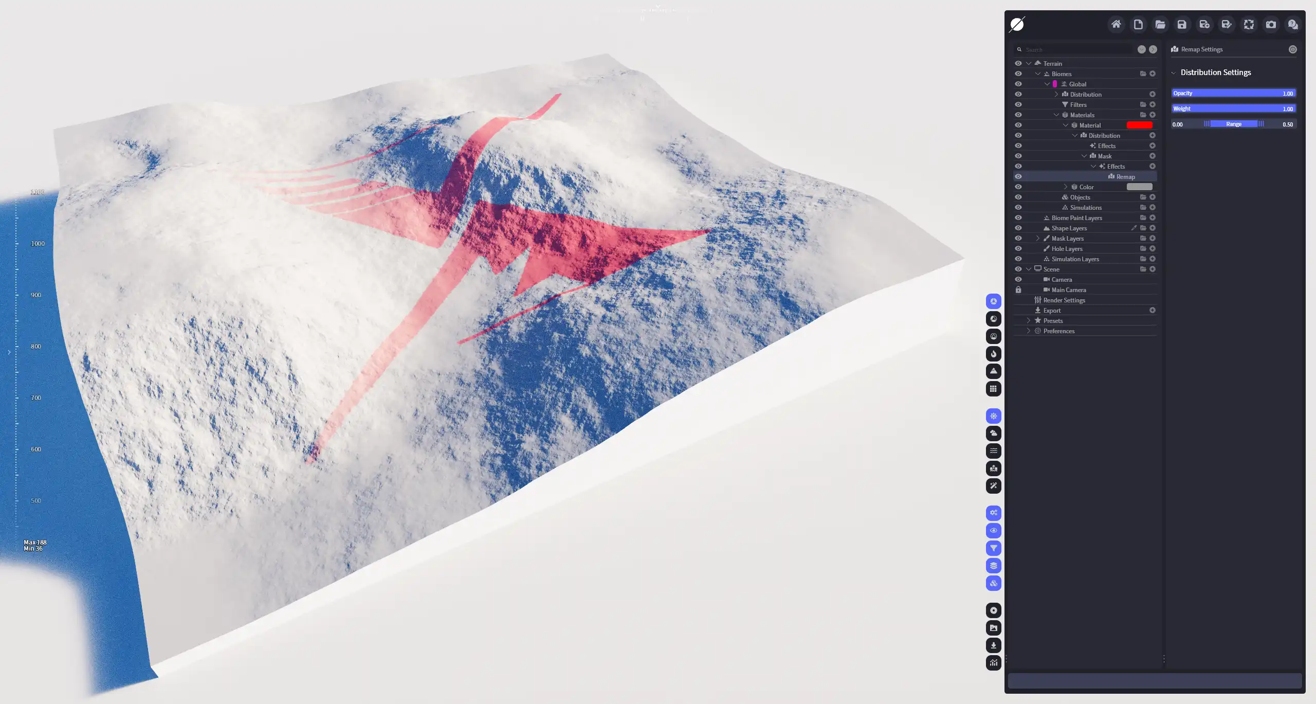 将整个分布图底按照指定范围重新映射。注意,此效果只能整体映射,不能精确调整分布区域的低值部分,因为非选区的数值也会随范围的变化而改变。