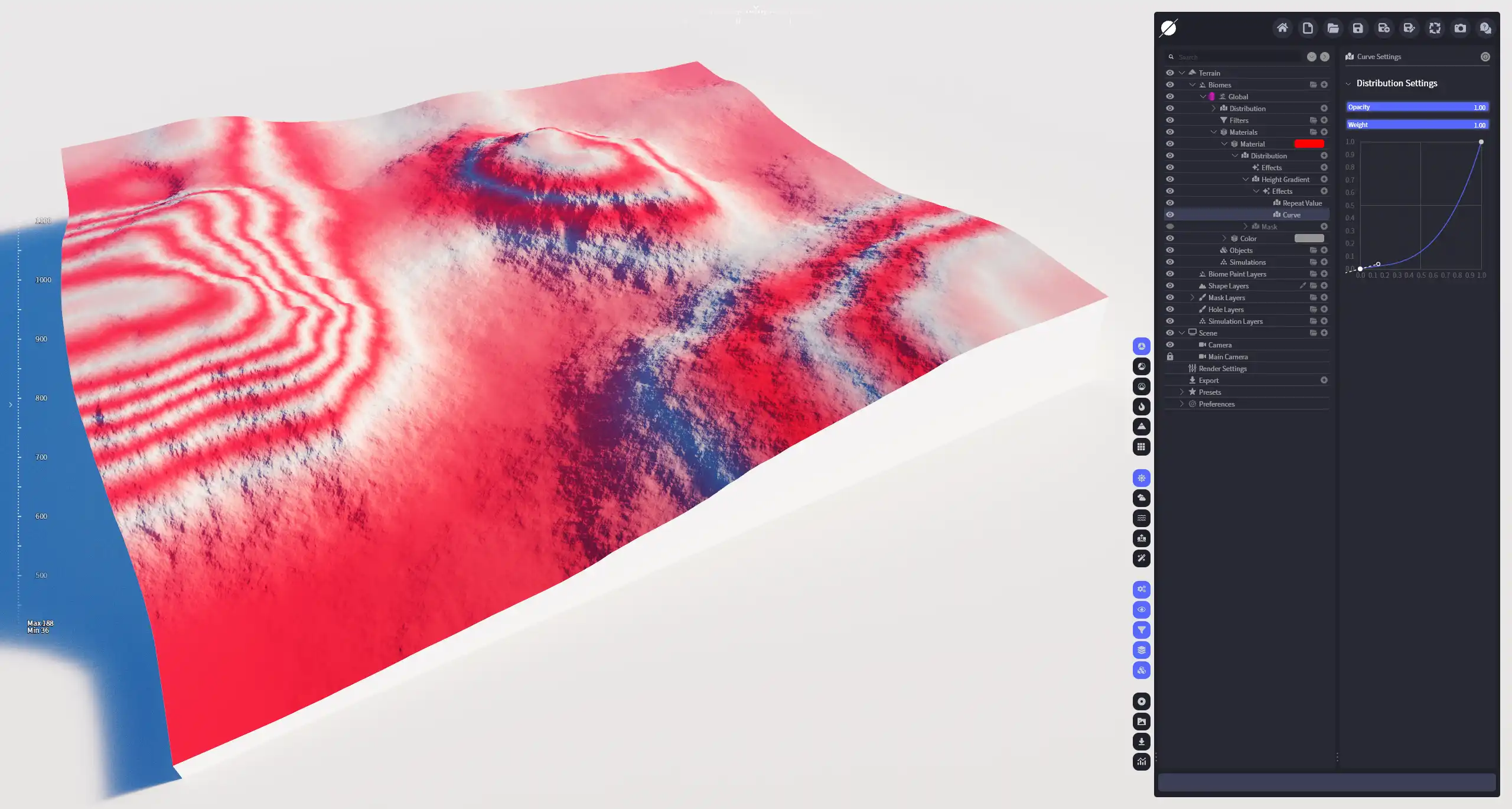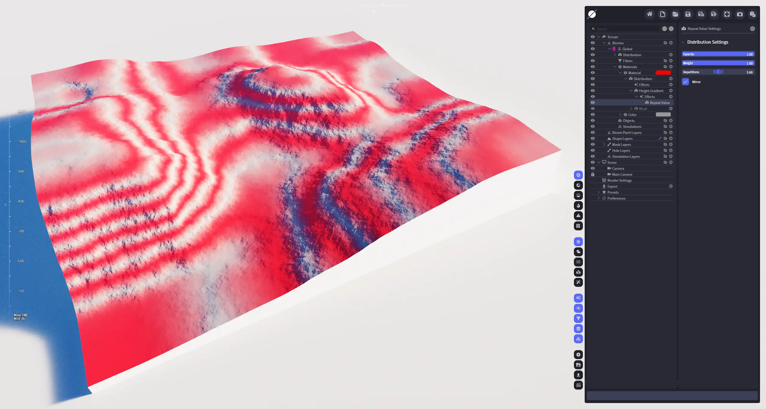 将分布区域按照高度划分成若干个高度区域,重复应用分布值。多用于高度渐变或类似分布。