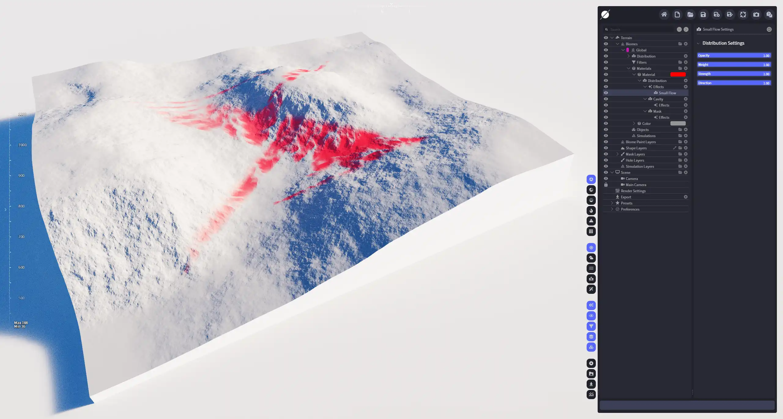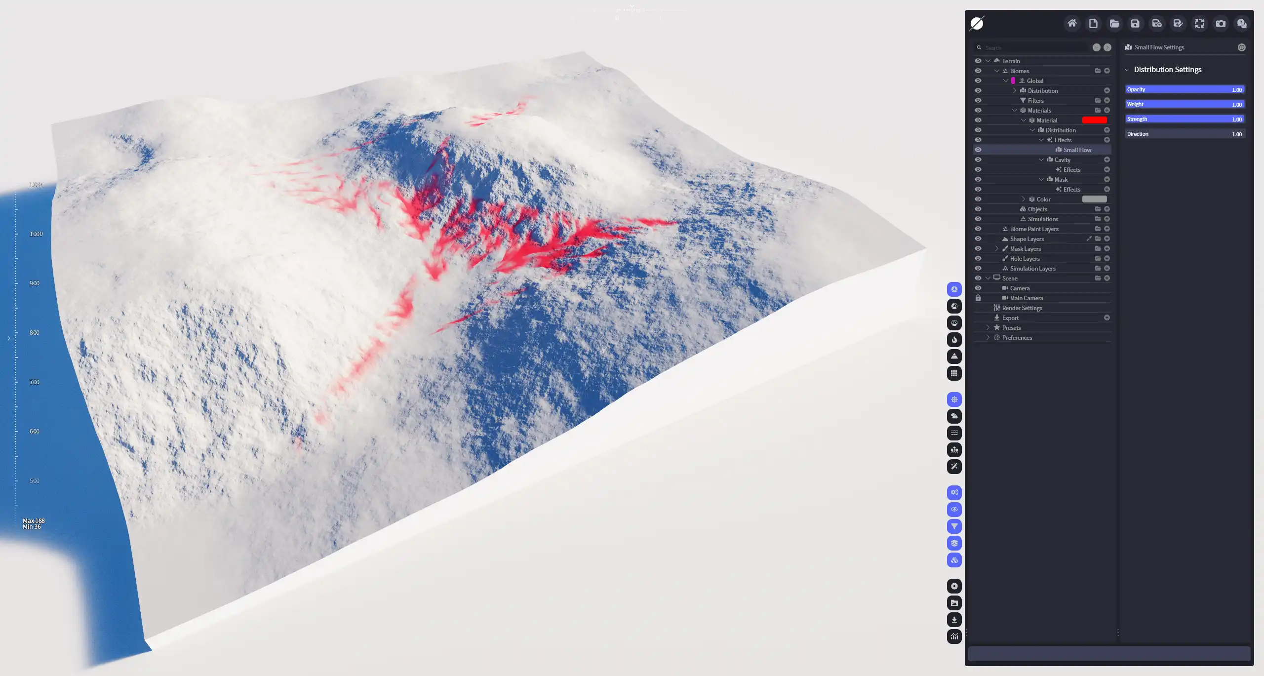 将分布的像素沿水流方向(或反方向)移动,产生类似水流的效果。跟普通流动不同的是,细小流动在移动像素时,除了有重力影响,还会同时判断相邻非零像素的位置,产生局部牵引的效果。