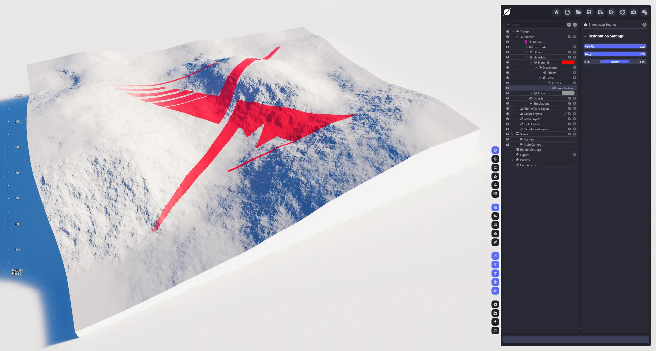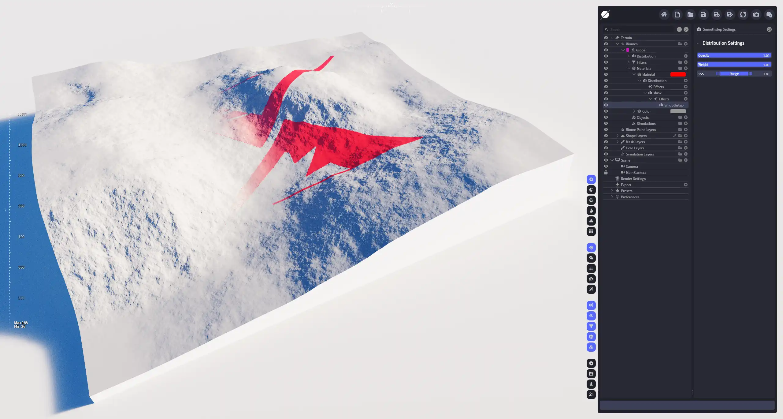 对分布范围代入平滑步进函数,用于调节过渡区域的平滑度;它的原理和 重映射 类似,但是比重映射更加灵活,对于渐变区域的可调性更高。