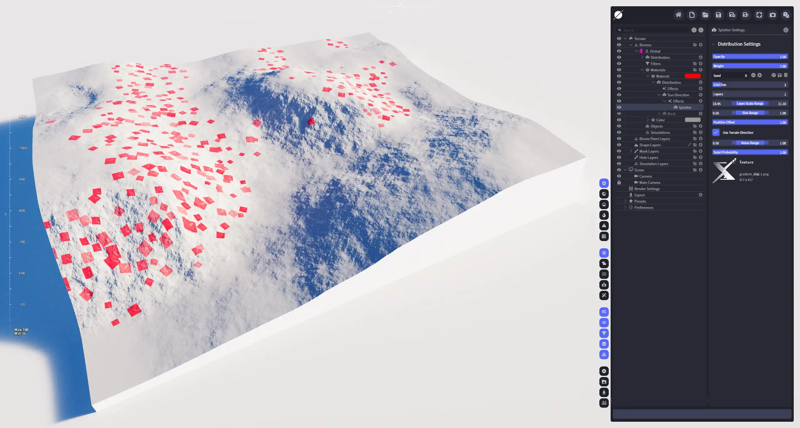 可以在分布范围内应用溅落效果,原理和 溅落 分布相同 。