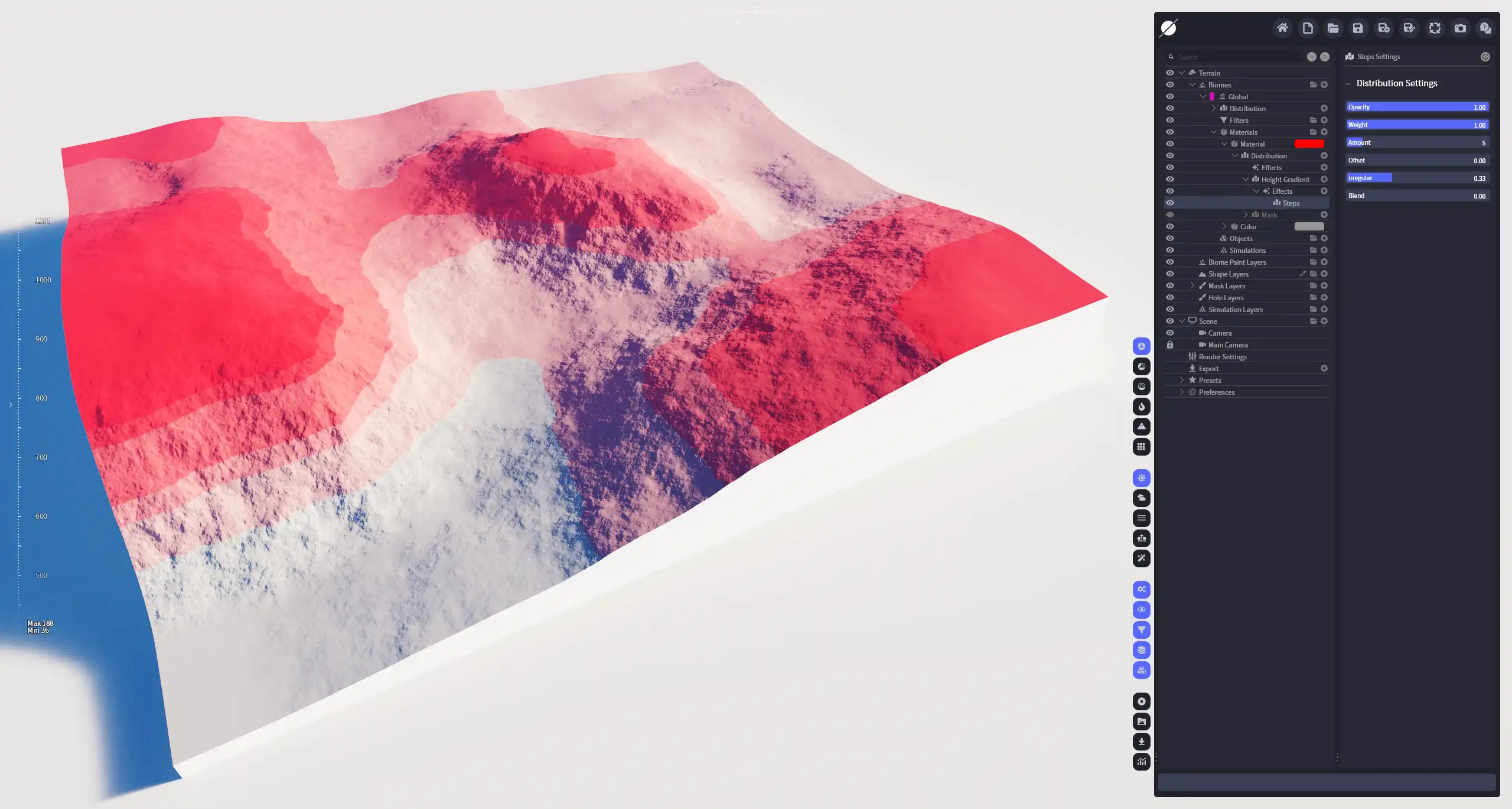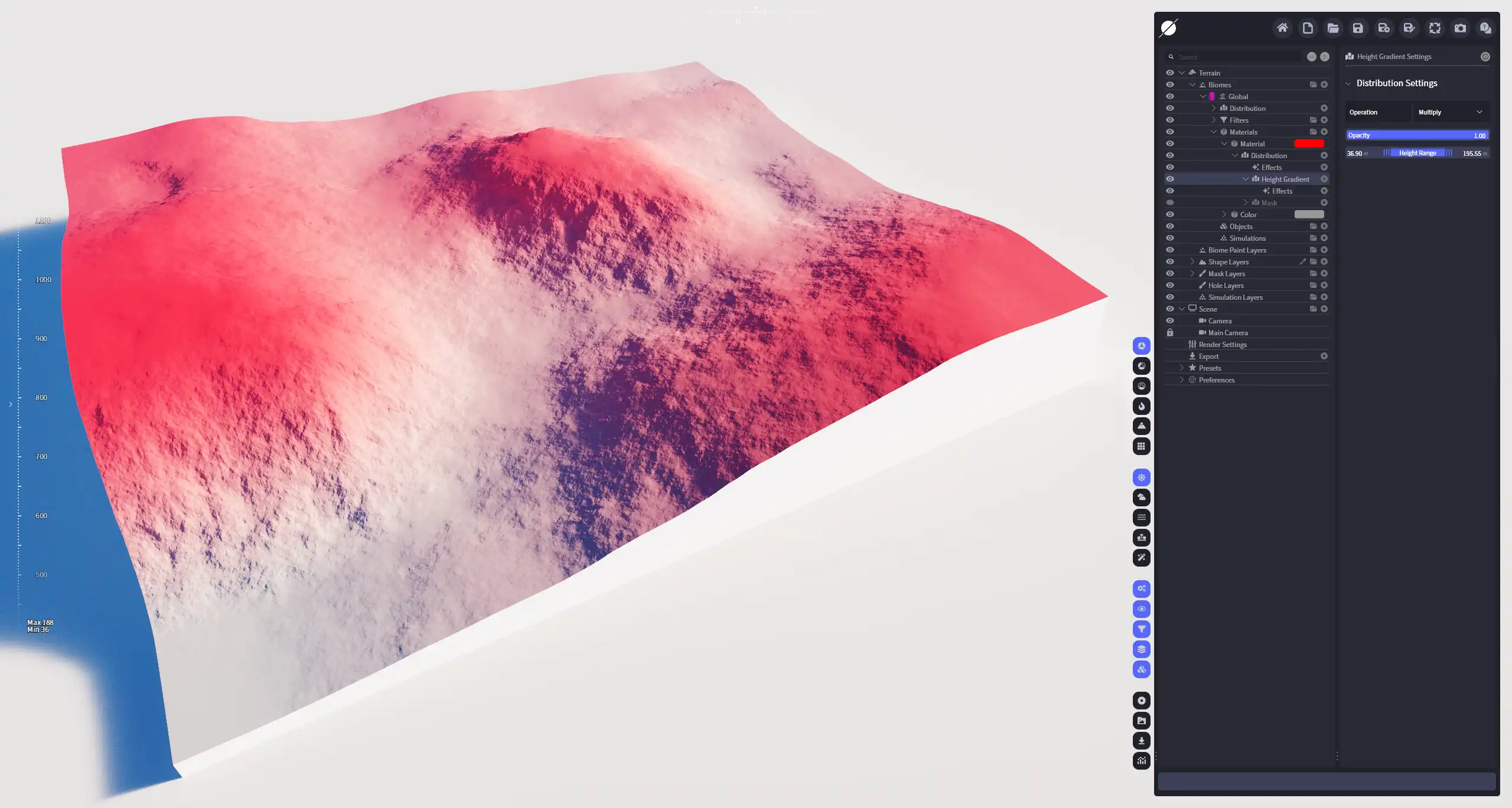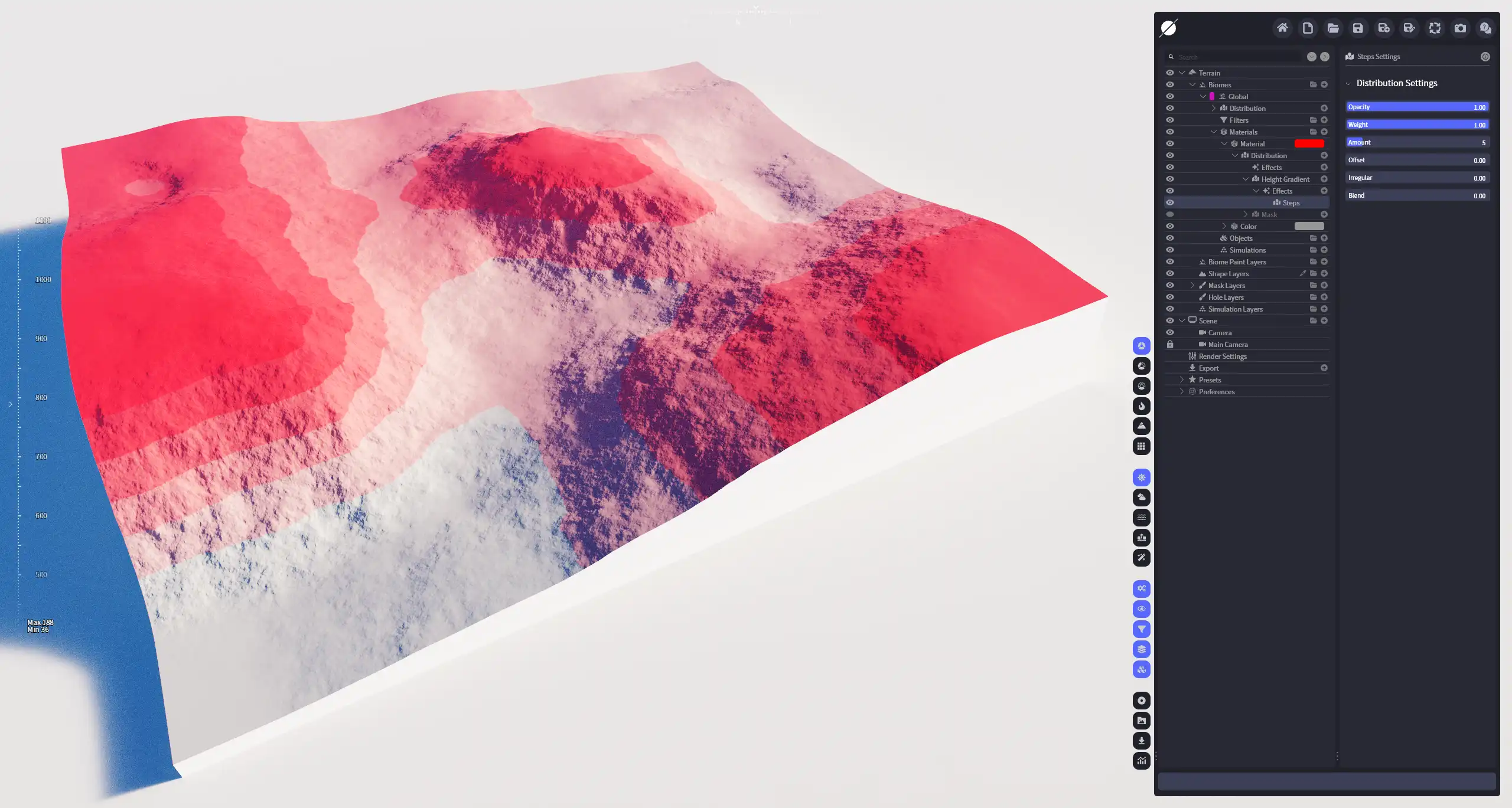 在分布选择区域按照高度区间生成阶梯状的不同数值区域,其原理和 常规 过滤器类似。可以和渐变分布结合使用,生成不同色彩的分层效果。